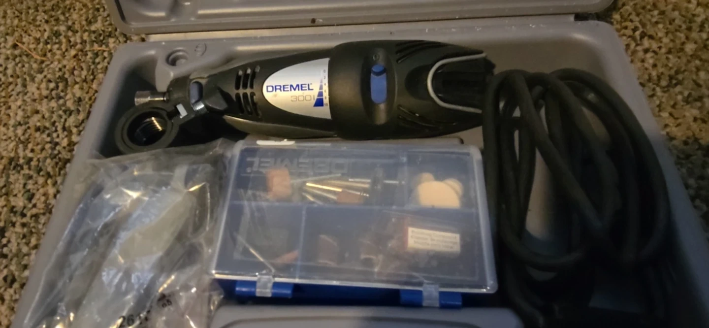 This Dremel 3001 rotary tool comes in its original case with various accessories. It features a variable speed setting up to 10. A handy kit for crafting and DIY projects! Includes case and 25 accessories EUC