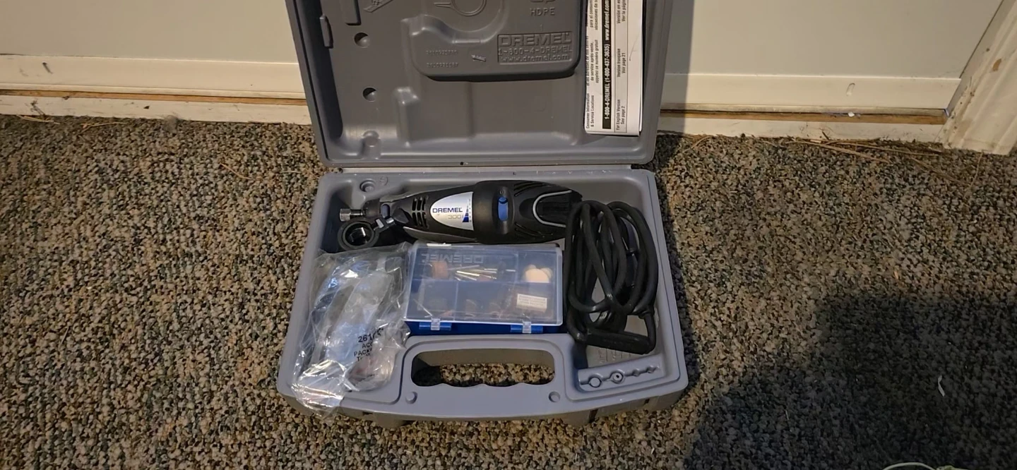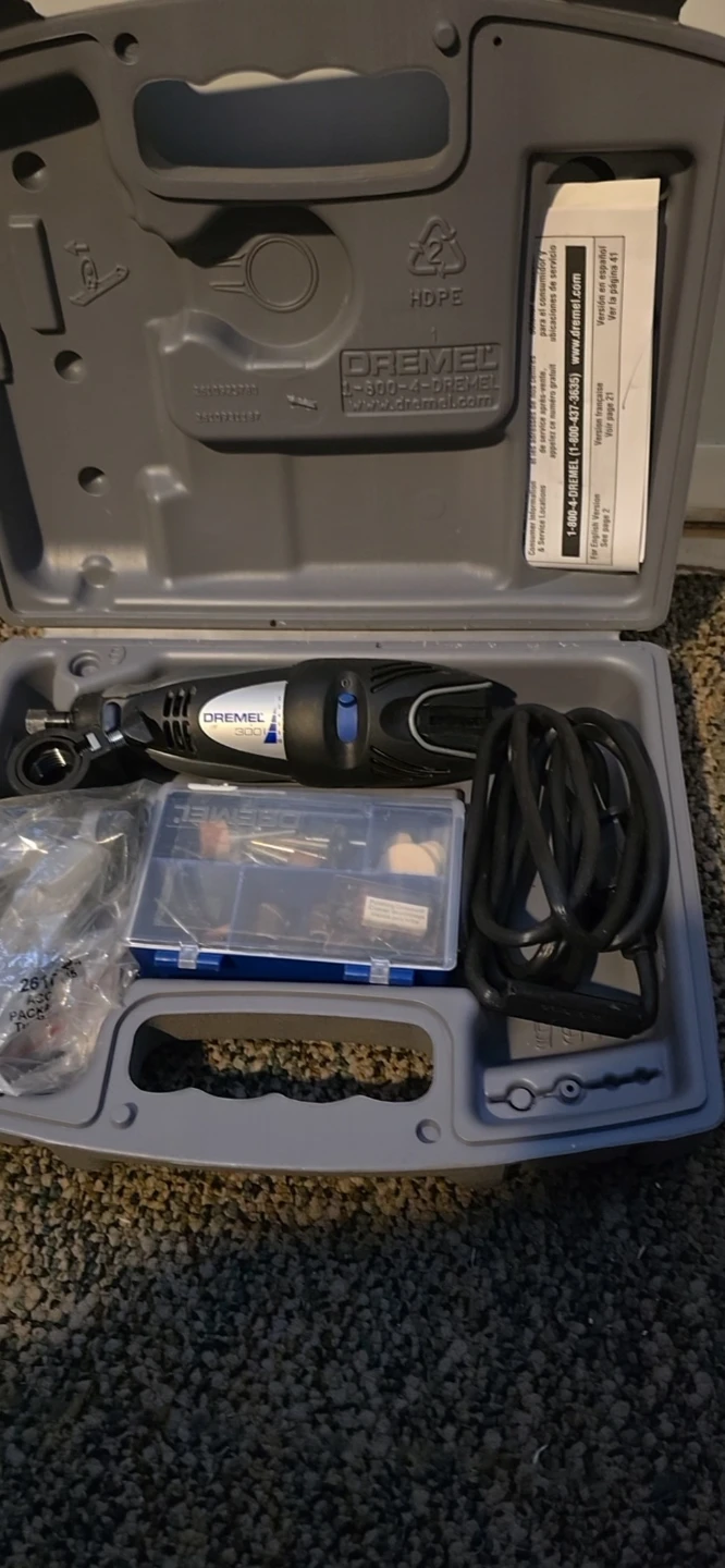 This Dremel 3001 rotary tool comes in its original case with various accessories. It features a variable speed setting up to 10. A handy kit for crafting and DIY projects! Includes case and 25 accessories EUC