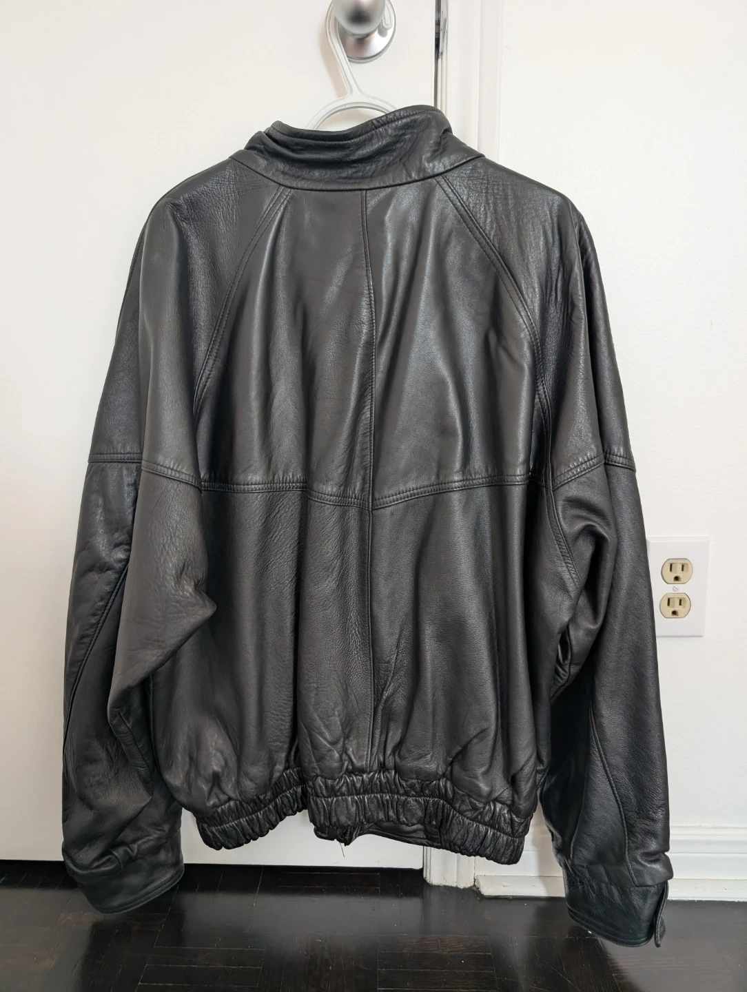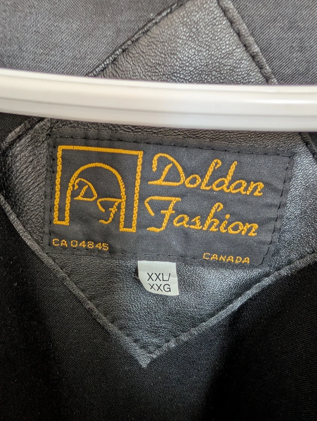 This is a black leather bomber jacket with embroidered "CASINO RAMA" logo. It features a full zip closure and elasticated cuffs and hem. Leather material. It is made in Canada!