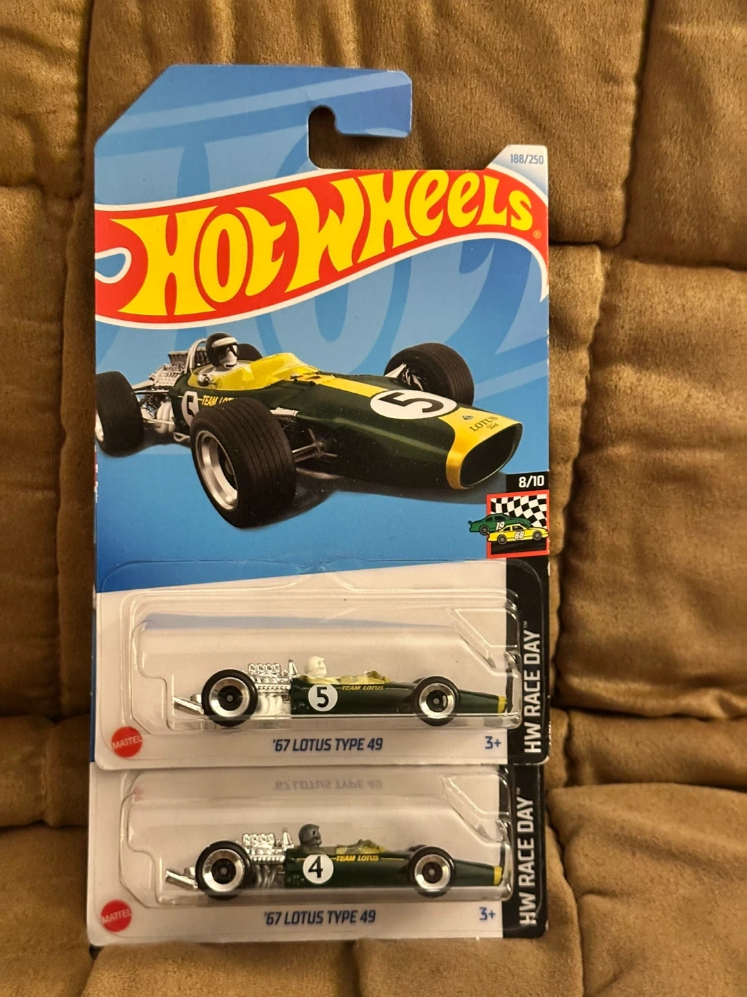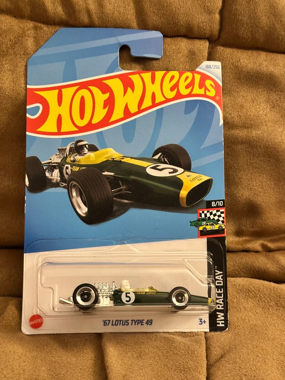 This is a Hot Wheels die-cast model of the '67 Lotus Type 49 race car. It's part of the HW Race Day series. Recommended for ages 3 and up.