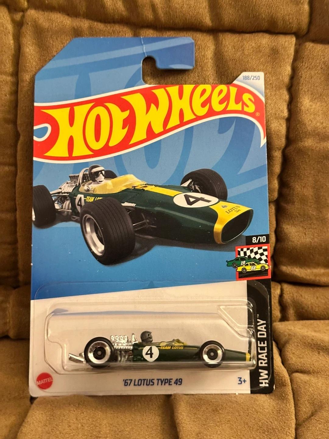 This is a Hot Wheels die-cast model of the '67 Lotus Type 49 race car. It's part of the HW Race Day series. Recommended for ages 3 and up.