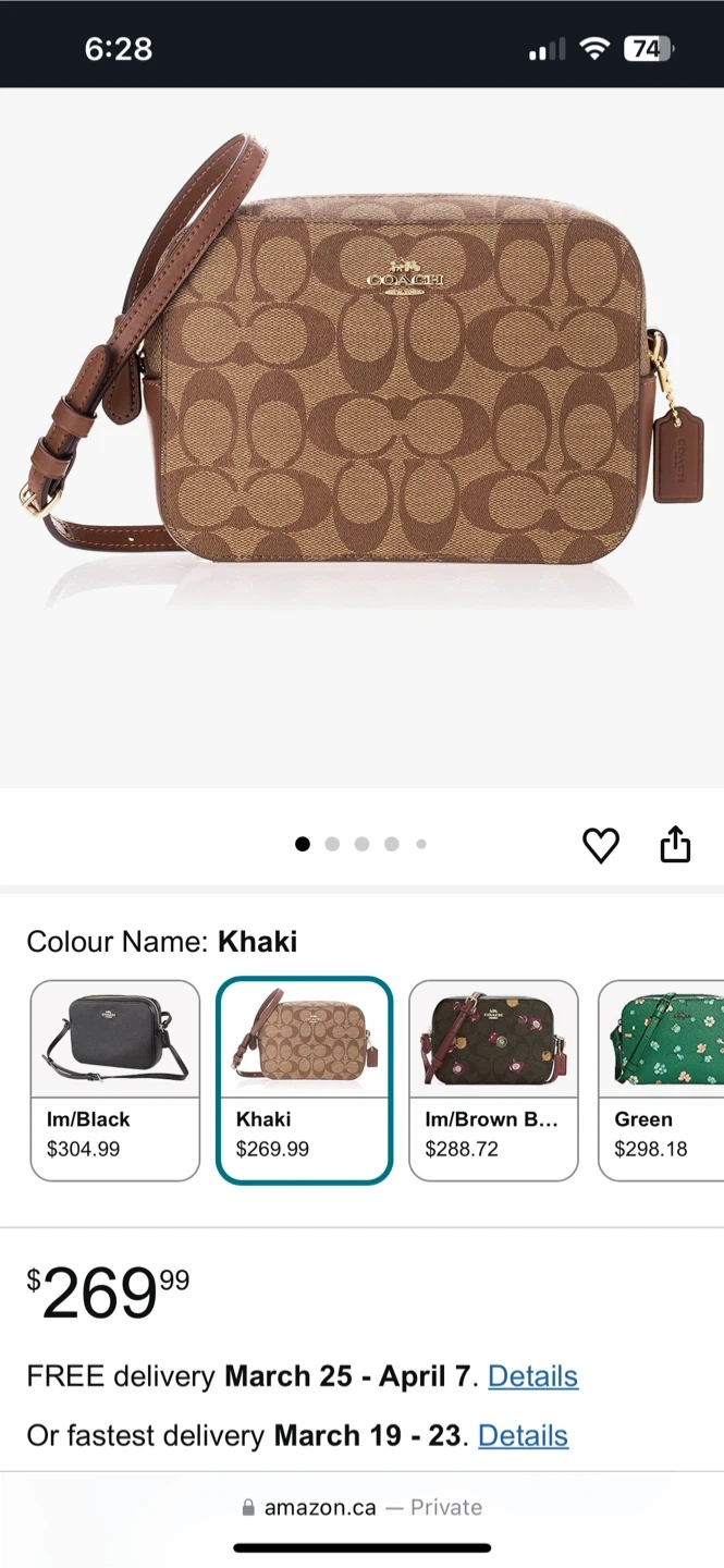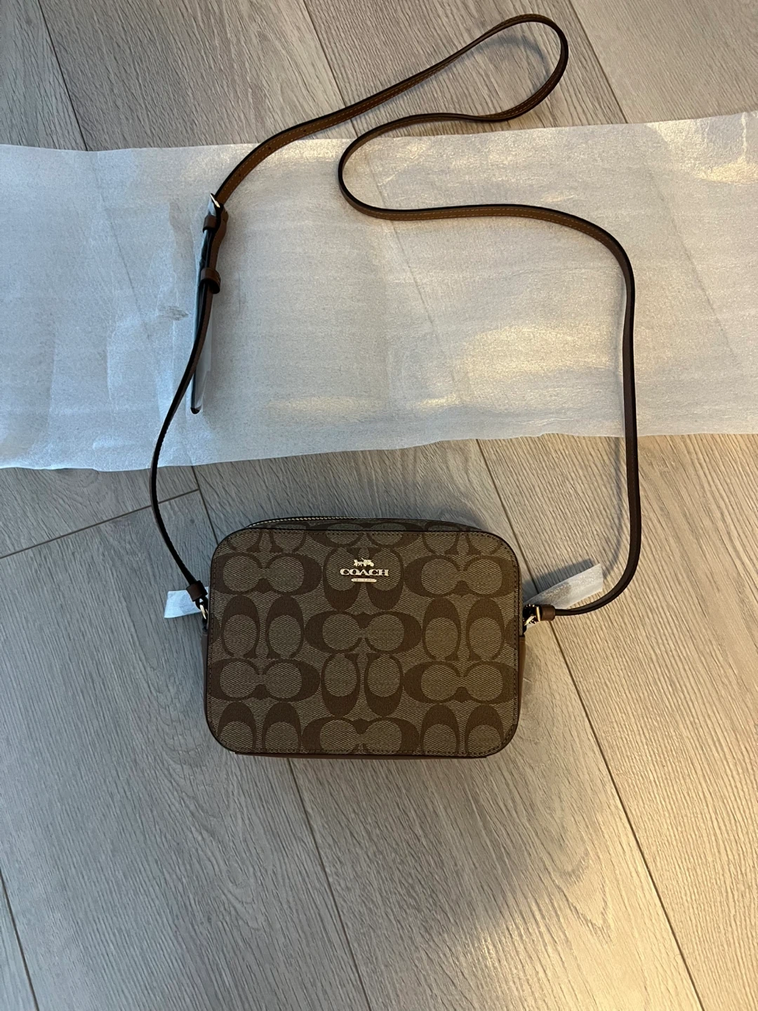 This is a Coach camera bag in the signature "C" pattern. It's a khaki colour with brown leather trim and a long crossbody strap. The bag has a zippered closure.