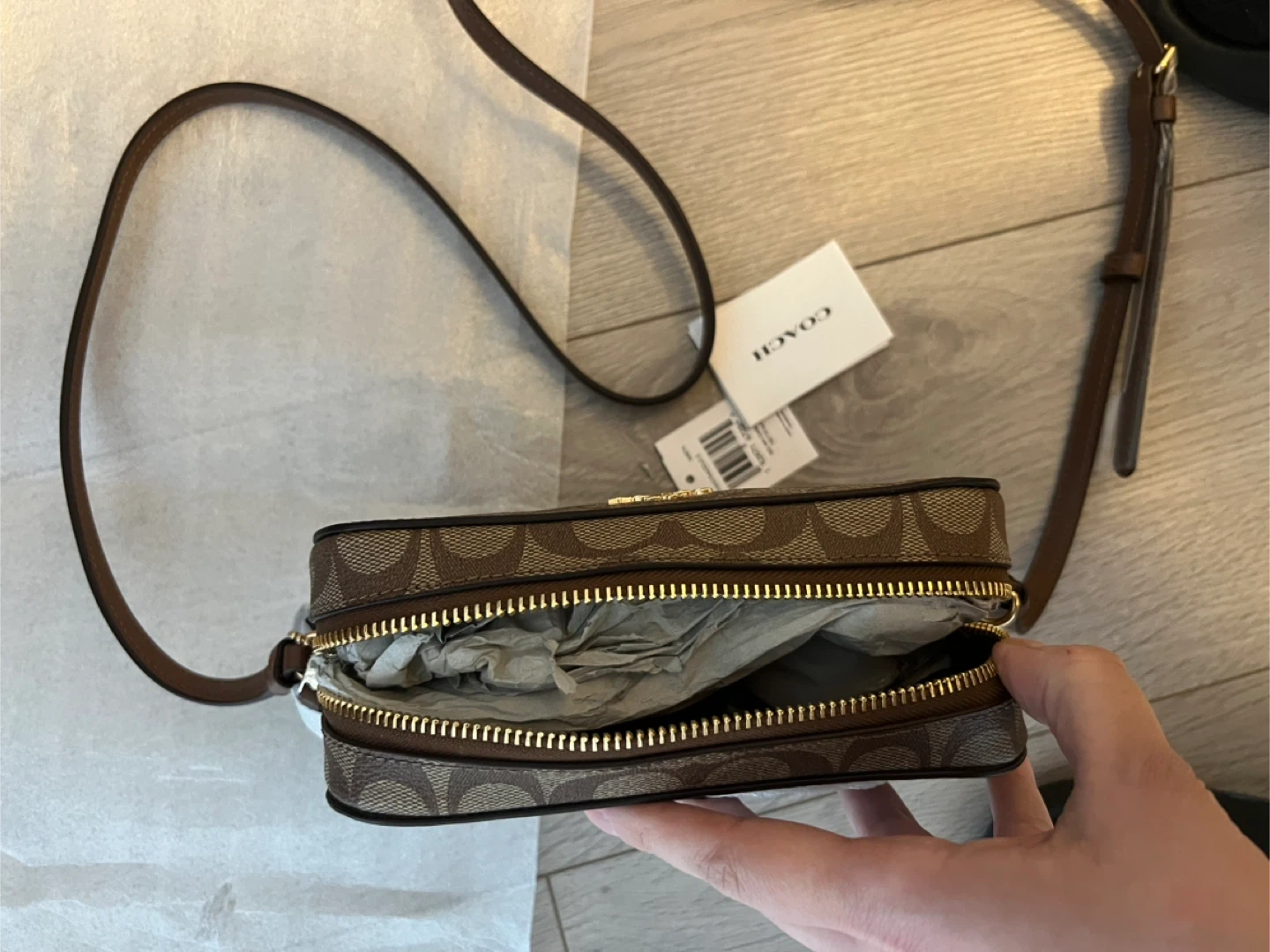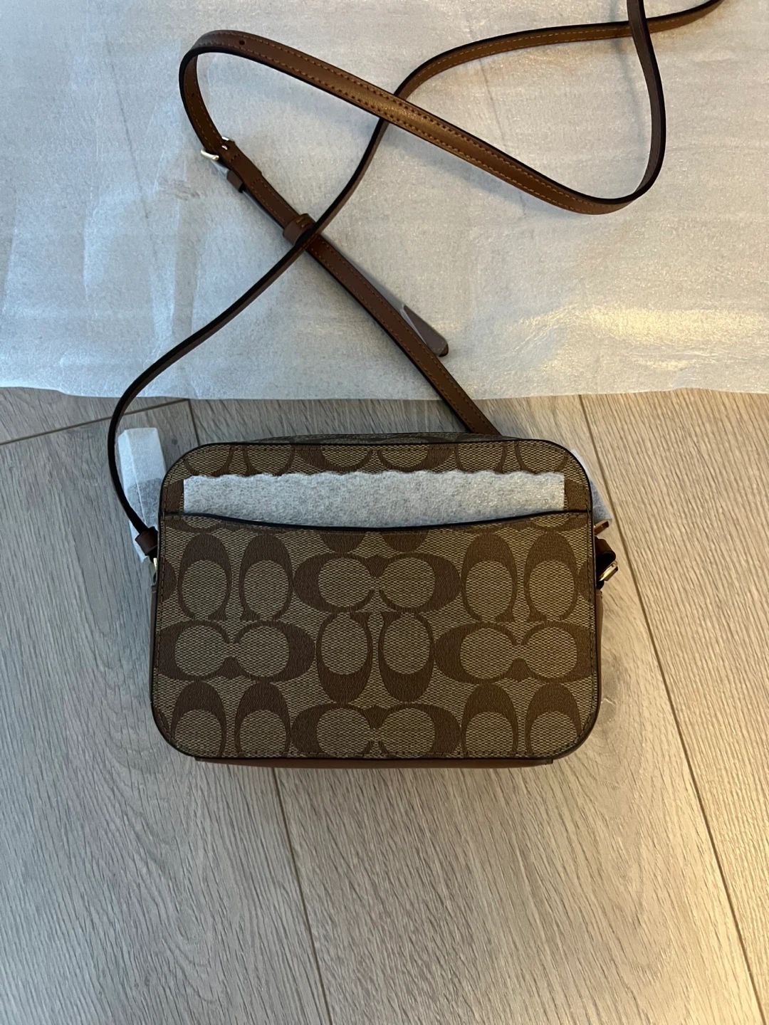This is a Coach camera bag in the signature "C" pattern. It's a khaki colour with brown leather trim and a long crossbody strap. The bag has a zippered closure.