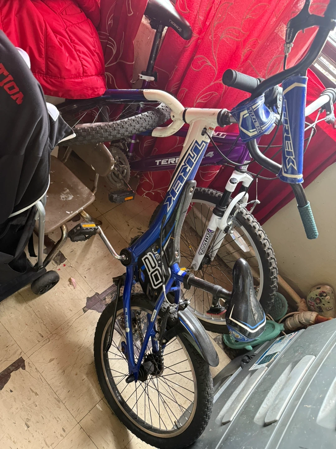 Selling a used Trek kids' bike, perfect for young riders! It's a 20-inch bike with a cool blue and white color scheme. Great for learning to ride or just cruising around the neighborhood