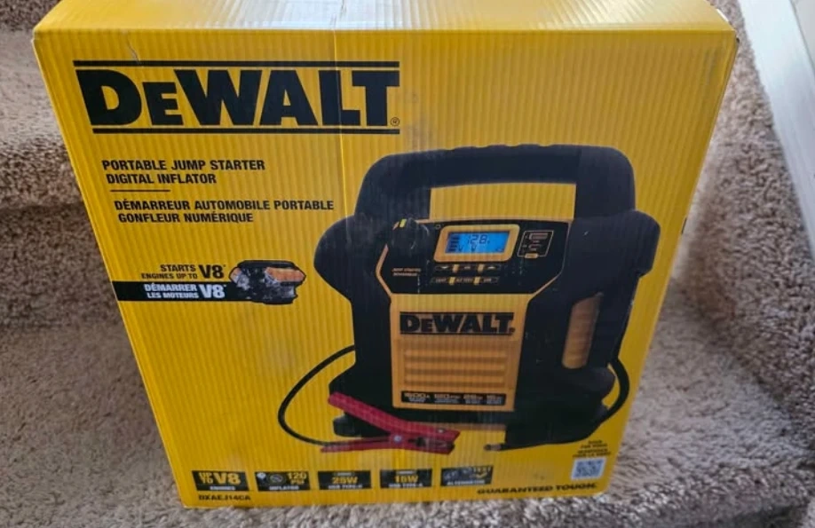 Selling a Dewalt portable jump starter and digital inflator, model DXAEJ14CA. It's designed for engines up to V8 and has a 120 PSI inflator. Includes the box