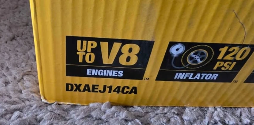 Selling a Dewalt portable jump starter and digital inflator, model DXAEJ14CA. It's designed for engines up to V8 and has a 120 PSI inflator. Includes the box