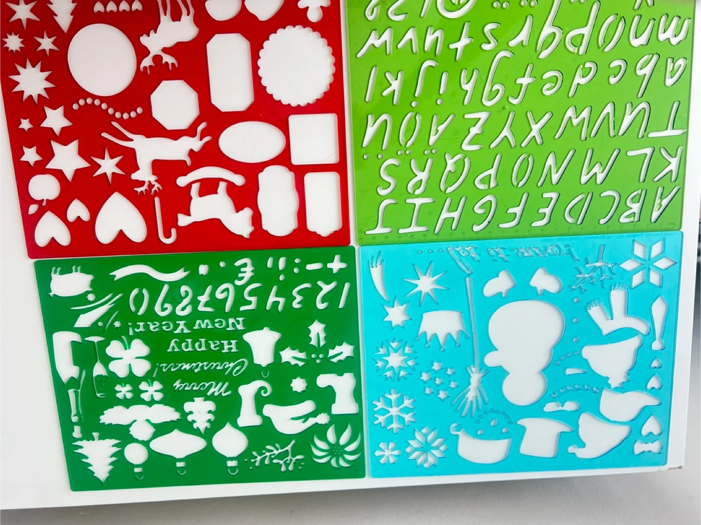 Selling a Tchibo ProZente SCC stencil set. It's a 5-piece set for creatively designing cards and paper. Includes stencils with letters, numbers, and holiday themes like Christmas and New Year's. Box is included!