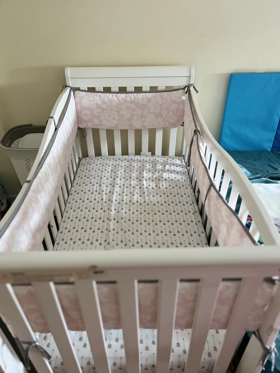 White crib with pink floral crib bumper pads and an arrow-patterned fitted sheet. Fits a standard crib. Including the crib mattress.