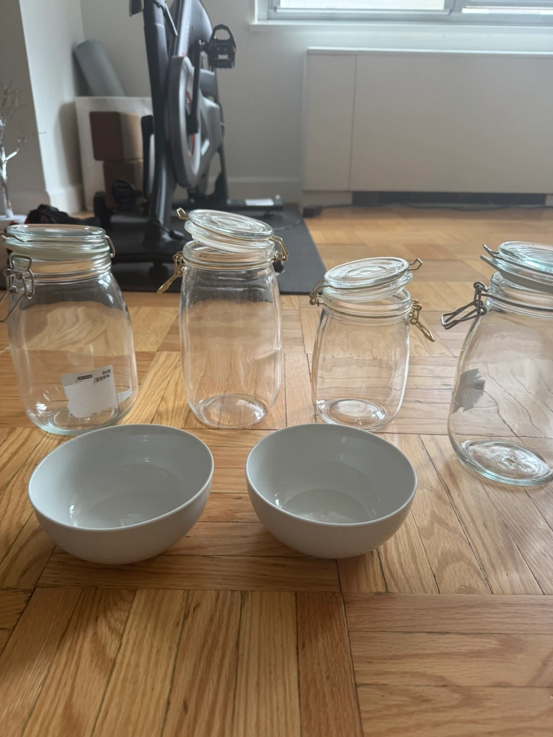 I'm selling a set of glass jars with lids and two white bowls. They're in great condition and ready for a new home! Perfect for storing dry goods or using as decorative pieces. The bowls are a simple, clean design that will complement any kitchen.