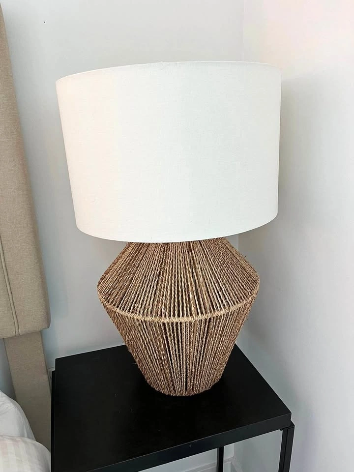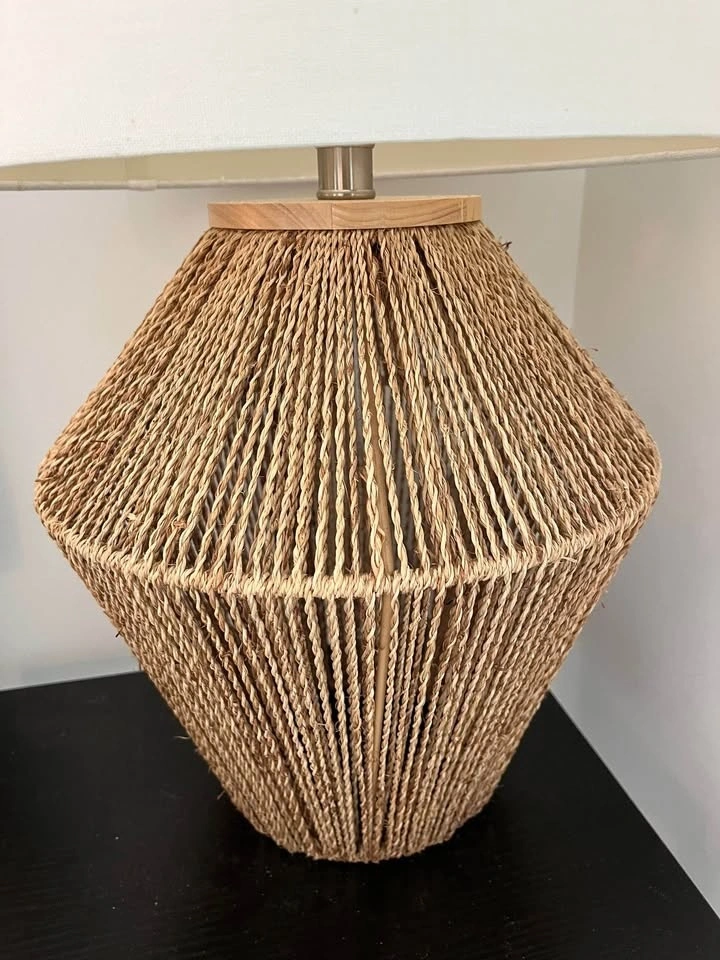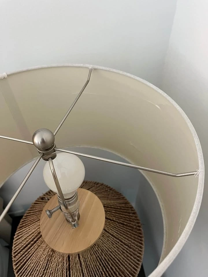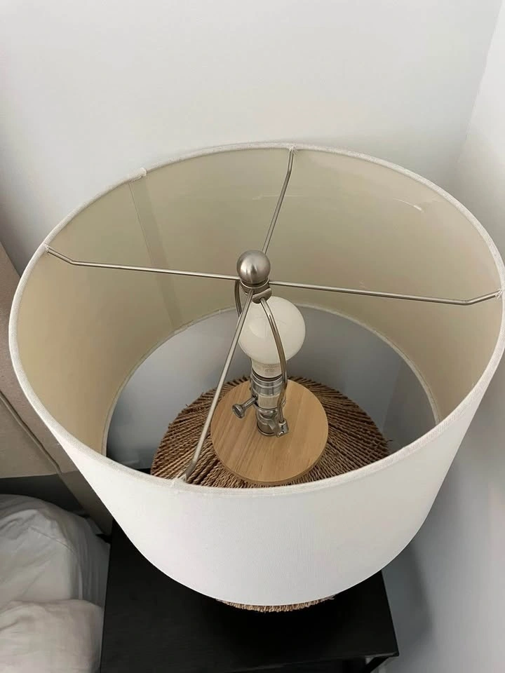 Stylish table lamp with a woven natural fiber base and white fabric shade. Features a wooden detail at the top of the base. Good condition, with minor marks inside the shade, as shown in the photo.