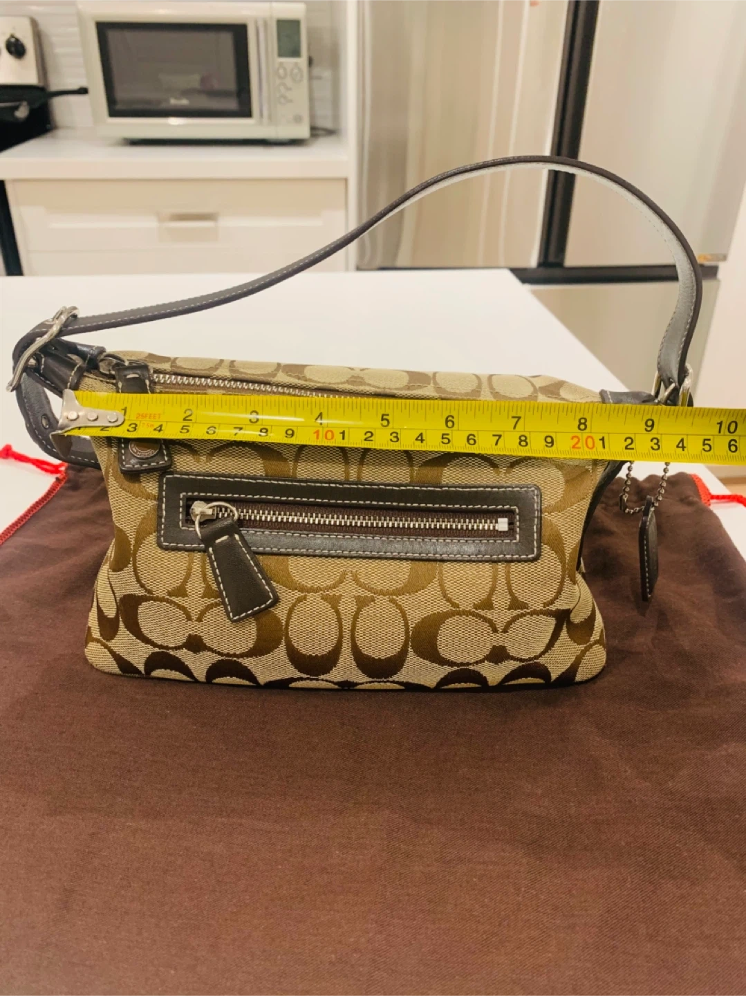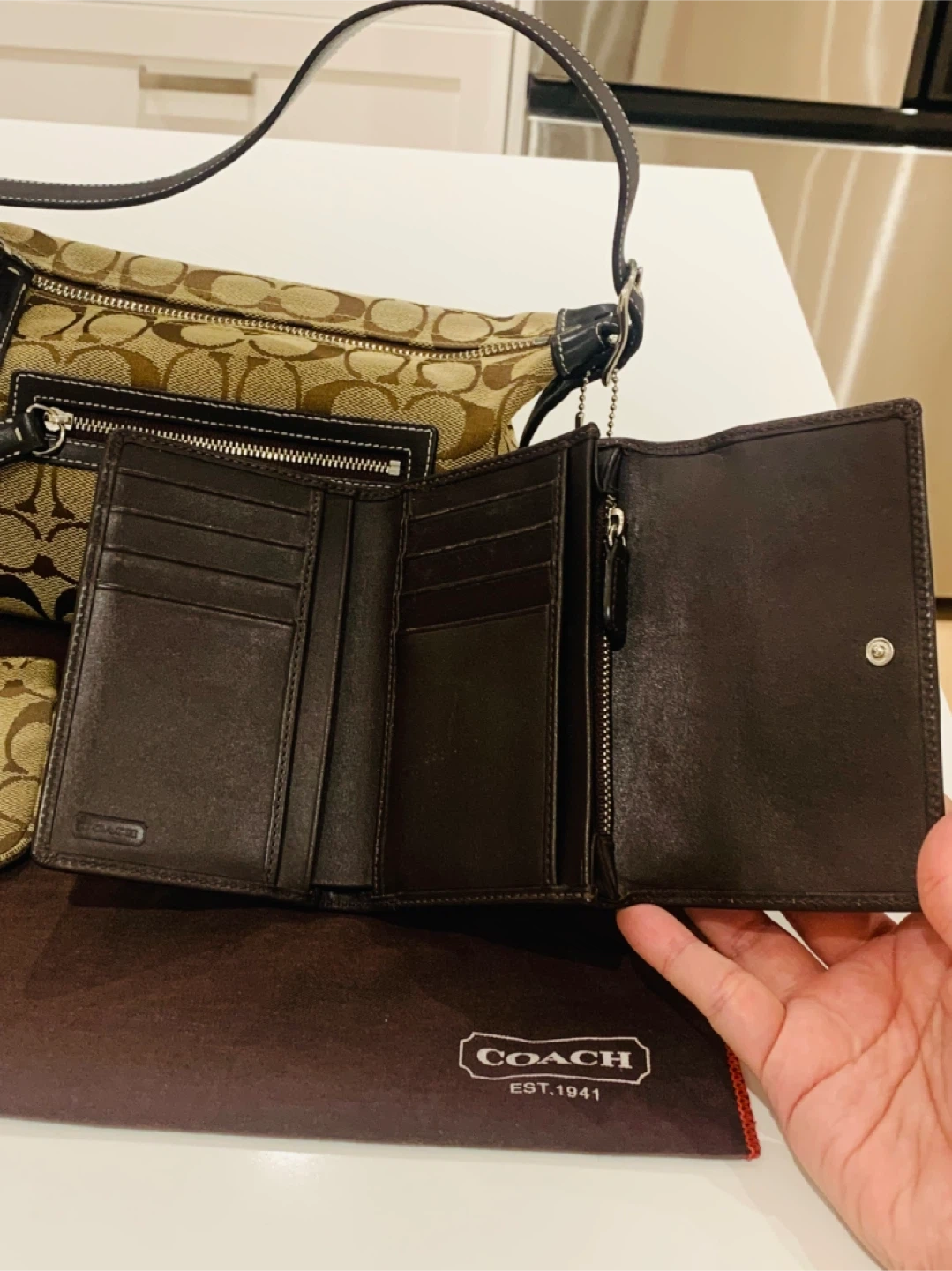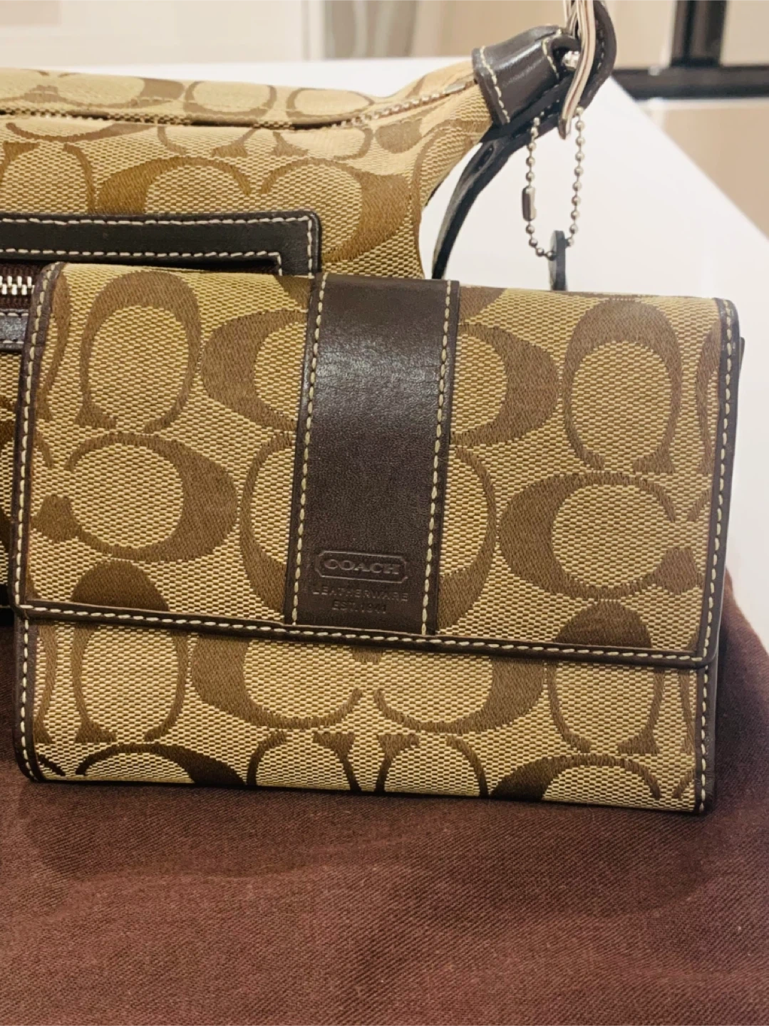 π»This is a Coach signature monogram canvas bag set that includes a shoulder bag, a wallet, and a wristlet.