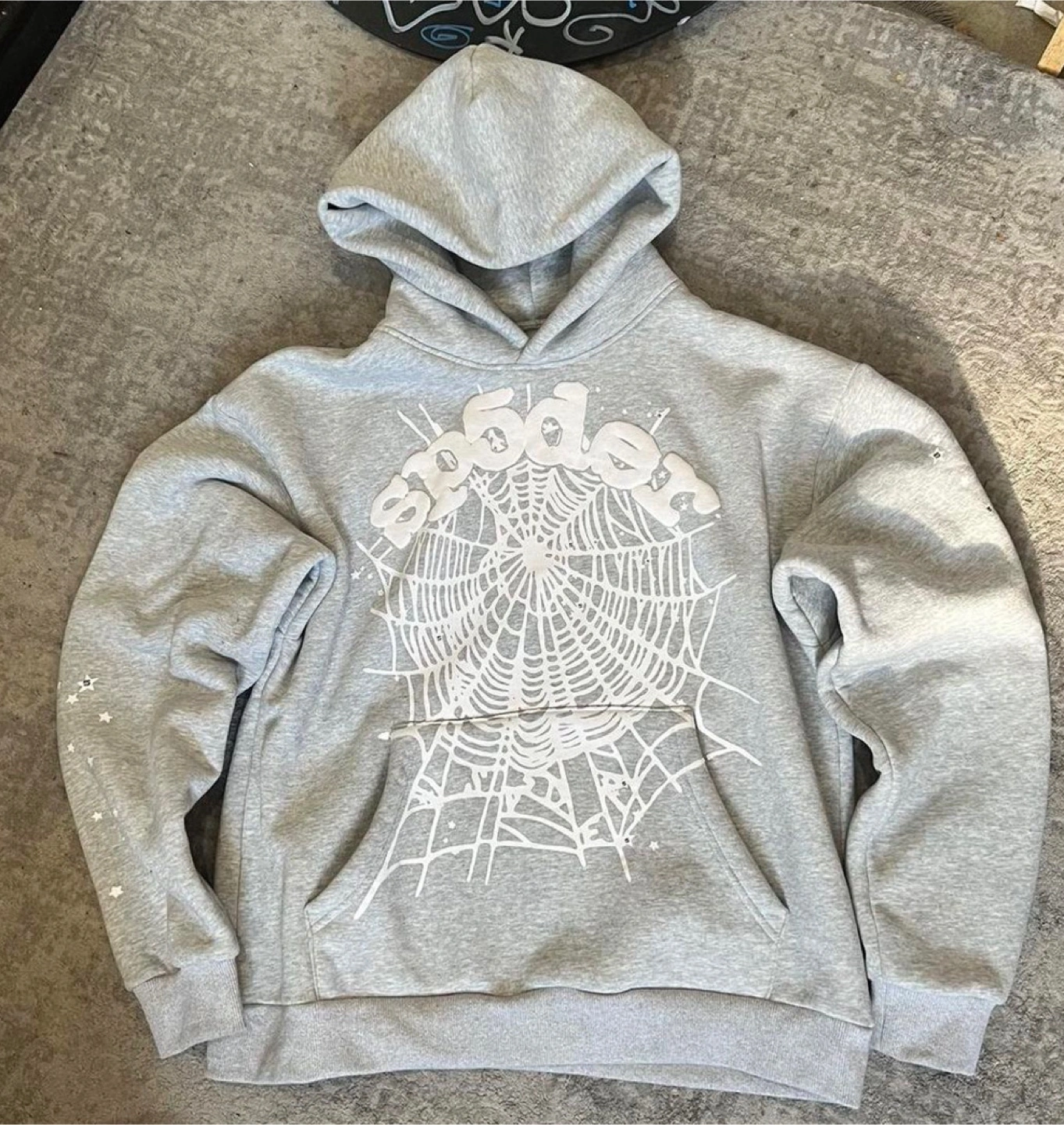 Selling a Sp5der hoodie in grey! It features a spiderweb design on the front and stars on the sleeves. It's in great condition and ready for a new home