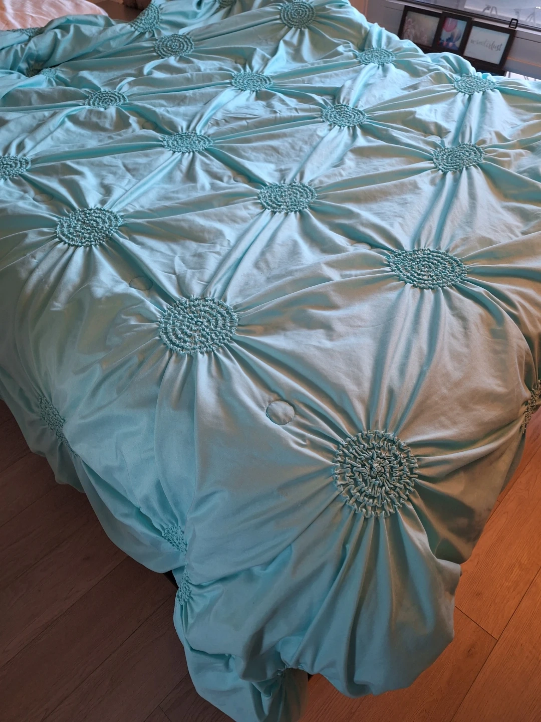 This aqua comforter features a lovely tufted design with circular patterns. It's made of a soft, smooth material that gives it a nice sheen. Adds a pop of colour to any bedroom!