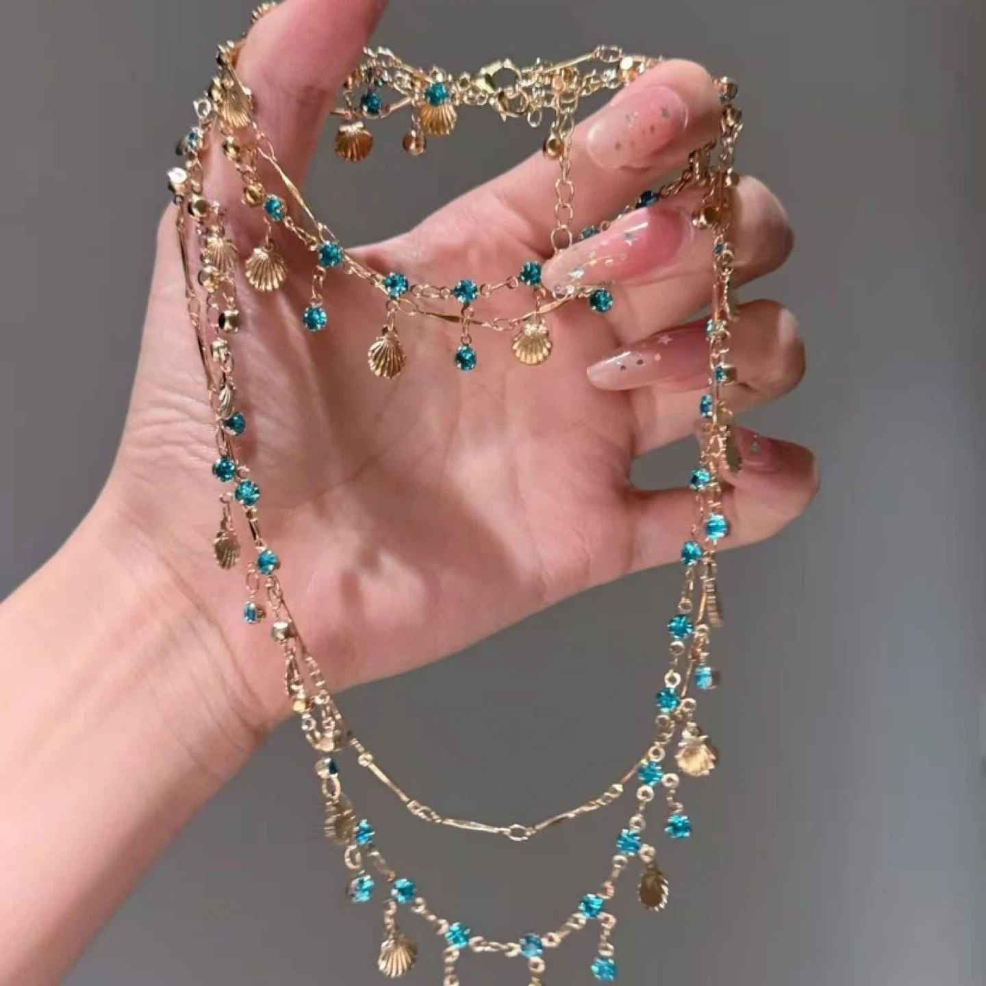 This is a gold-tone necklace with multiple delicate chains. It's adorned with small blue gemstones and miniature shell charms. It adds a touch of sparkle and a beachy vibe to any outfit!