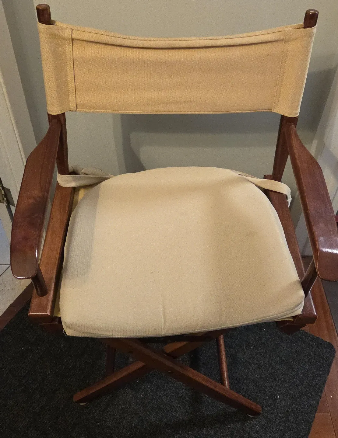 Classic director's chair with a wooden frame and canvas seat and back. It's a foldable design for easy storage. This chair is great for camping or extra seating at home!
