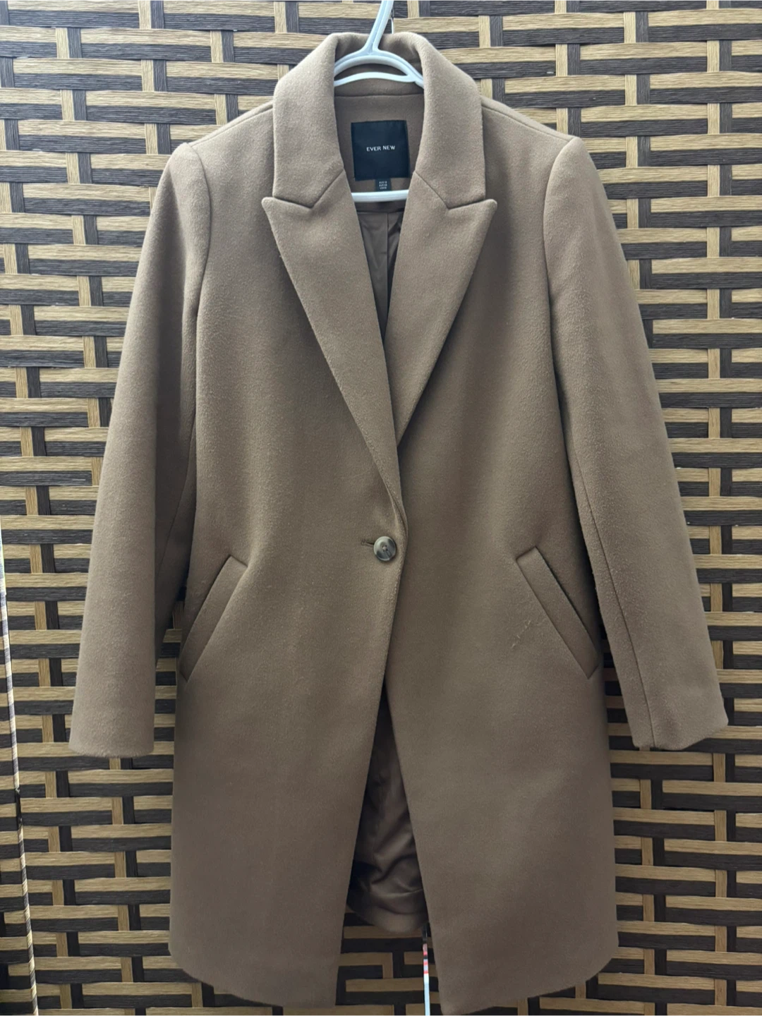 This is an Ever New camel coat. It's a size US 6. The coat features a single button closure and satin lining.