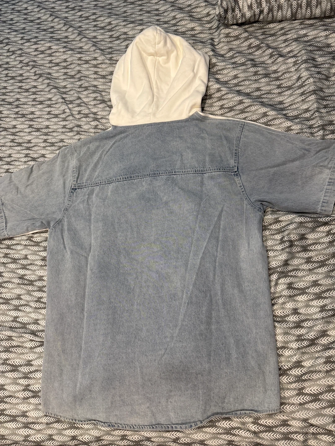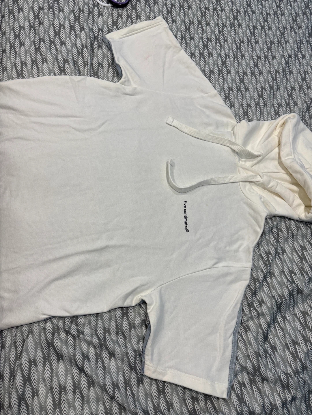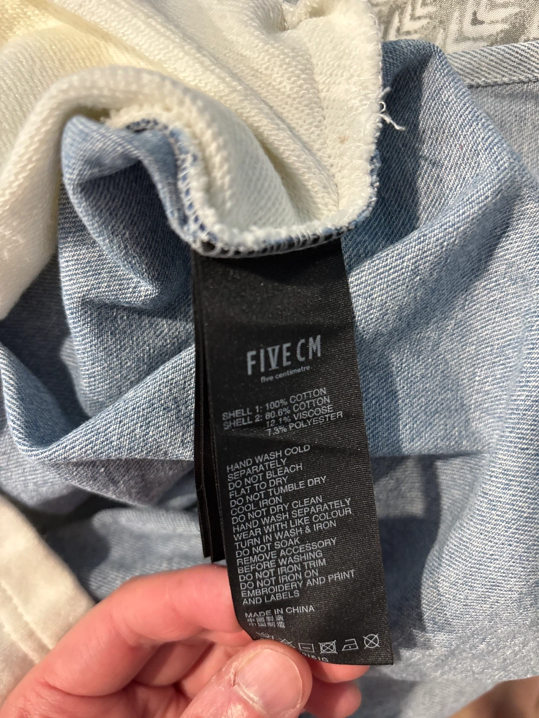 This FIVE CM short sleeve hoodie is a size small. It's made with 100% cotton shell 1 and shell 2, featuring 70% cotton, 20% viscose, and 13% polyester. It's a unique blend for a stylish look.
