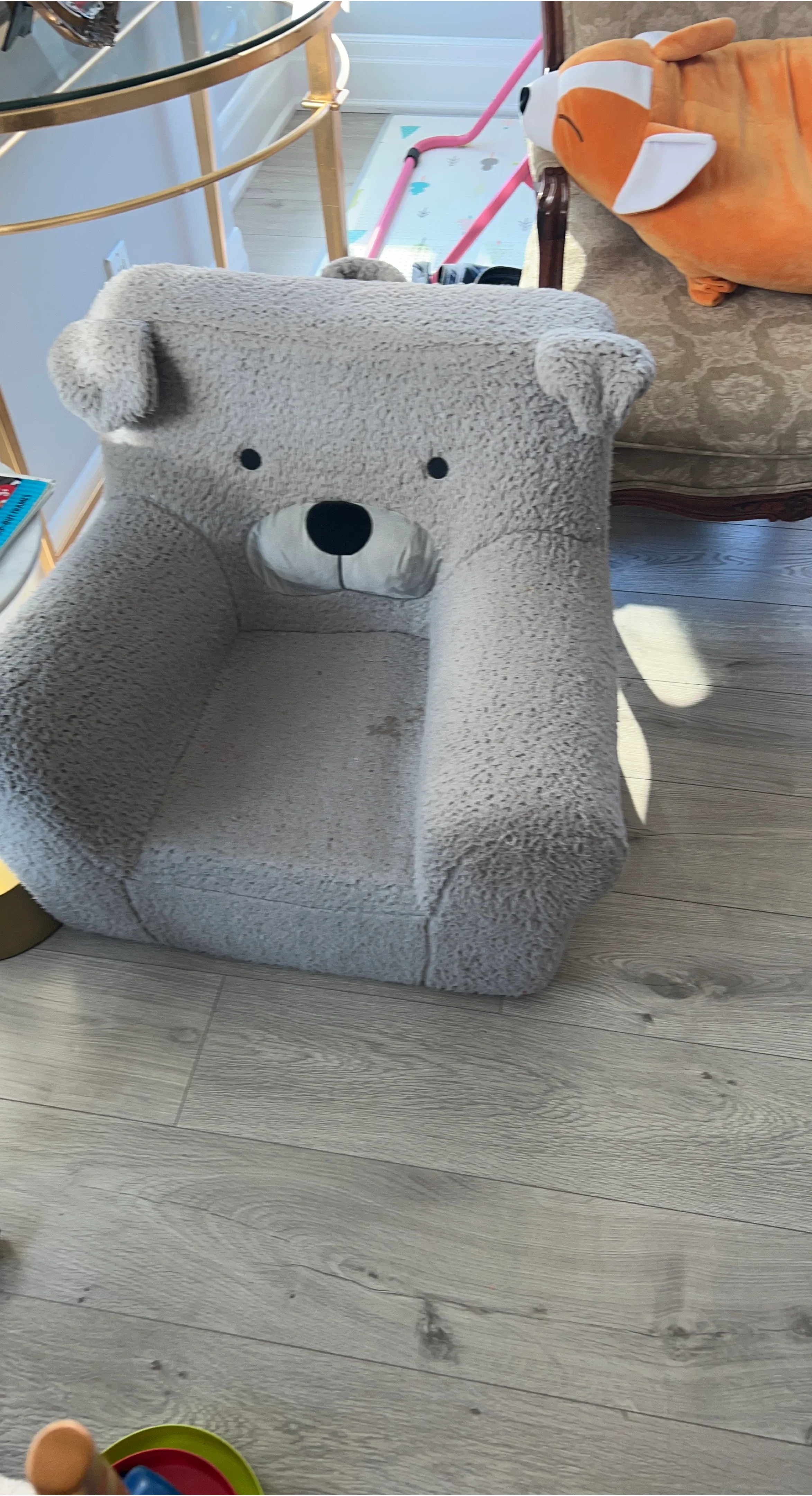 Comfy plush armchair designed to look like a teddy bear. It's perfect for little ones to relax in. Soft, grey, fuzzy material.