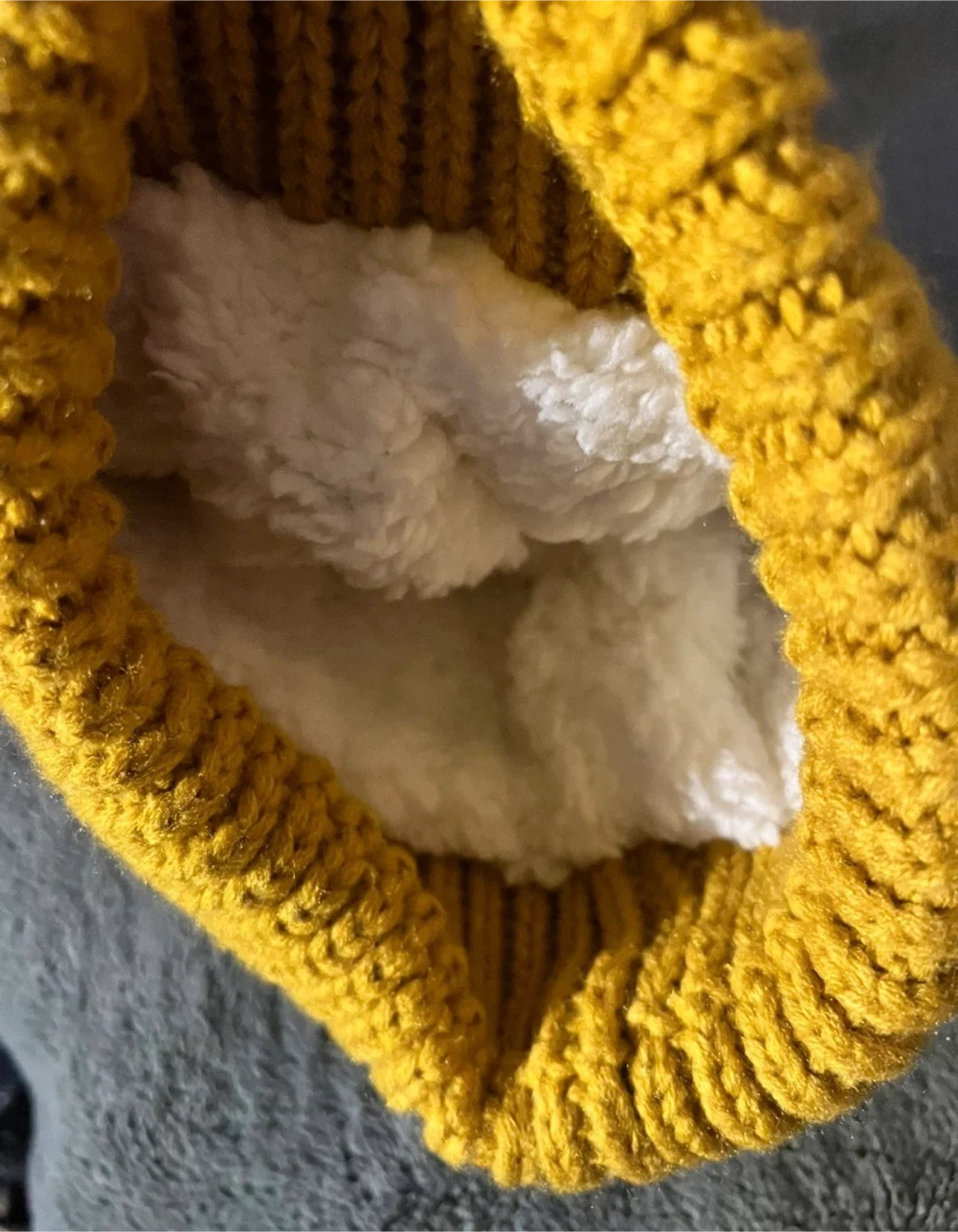 Cozy yellow knit beanie with a warm sherpa lining. Features a classic cable knit pattern and a faux fur pom-pom on top. This hat's lined for extra warmth.