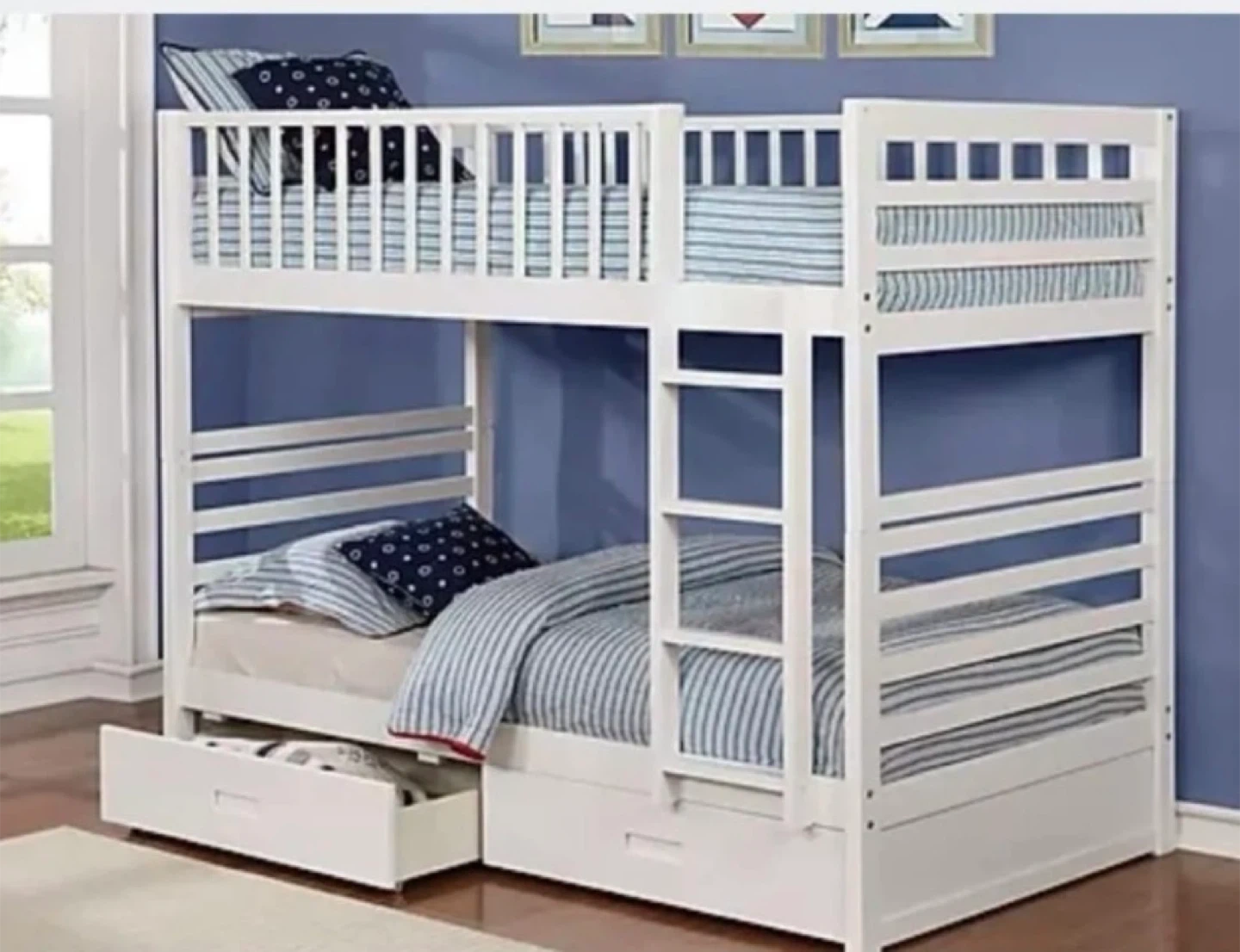 This white wooden bunk bed is perfect for a kids’ room. It’s made from sturdy wood and includes a built-in ladder for easy access to the top bunk. The bed fits two standard twin-size mattresses. Assembly is required. Some bed slats need replacement as they are loose, and a few screws or connectors may be missing; replacements are inexpensive and easy to find at Home Depot. Shipping is not available—pickup only. The bunk bed fits easily in a van or truck.