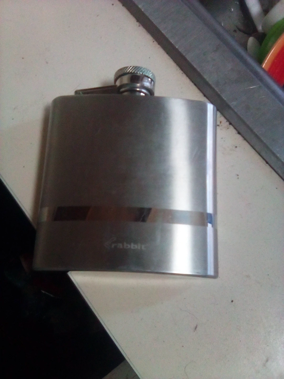 This is a stainless steel hip flask by Rabbit. It has a capacity of 8oz and features a secure screw-top lid. Great for carrying your favorite beverage.