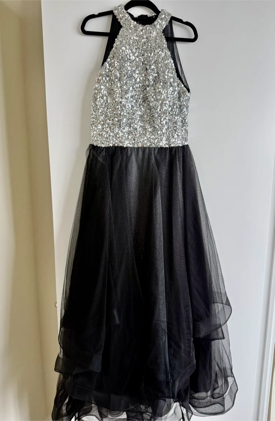 This dress features a dazzling silver sequin bodice with a black mesh halter neckline. It has a full black tulle skirt with layered ruffles. Perfect for special occasions or parties!