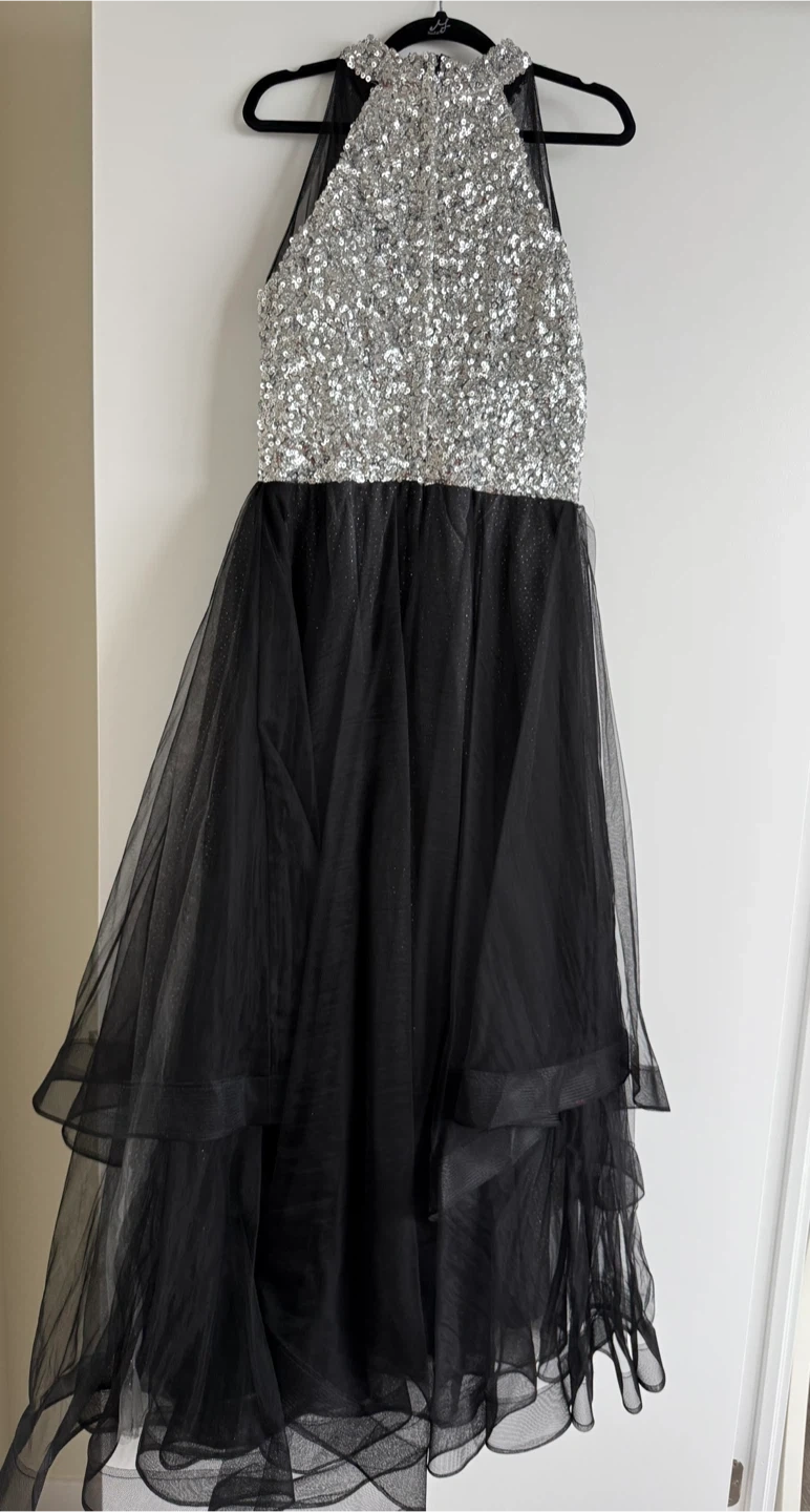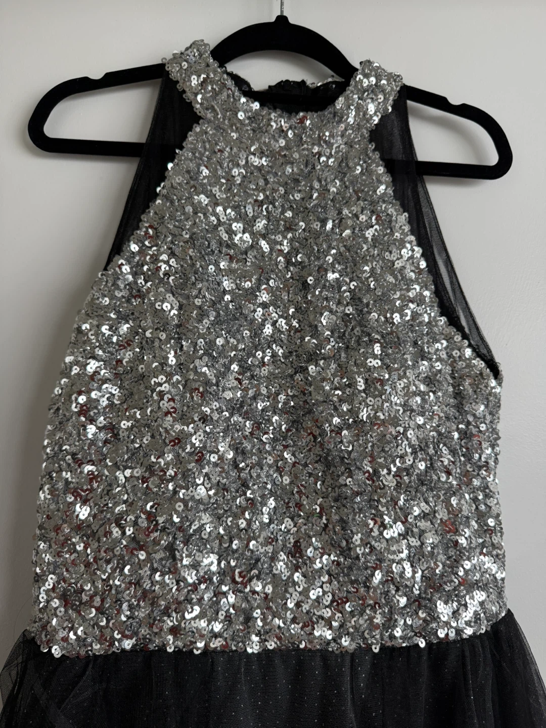 This dress features a dazzling silver sequin bodice with a black mesh halter neckline. It has a full black tulle skirt with layered ruffles. Perfect for special occasions or parties!