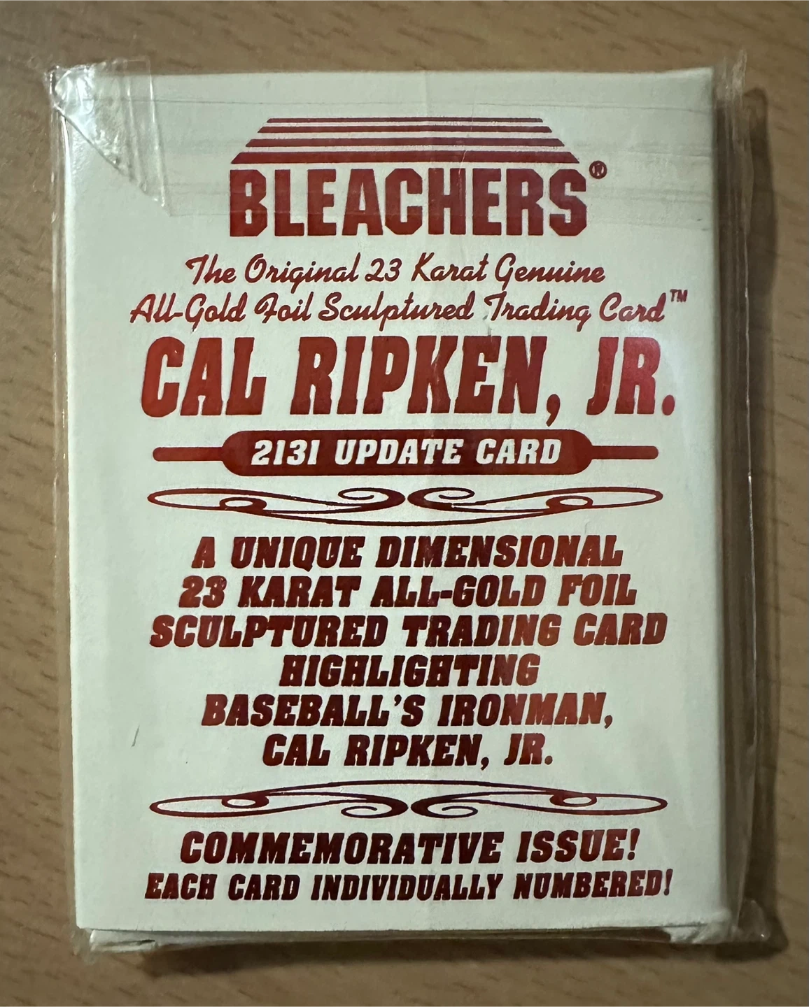 Selling a commemorative issue Cal Ripken Jr. trading card from Bleachers! This unique dimensional card features 23 karat all-gold foil sculpting, highlighting baseball's ironman, Cal Ripken Jr. Each card is individually numbered and commemorates his record-breaking 2131 consecutive game streak from Sept 6, 1995