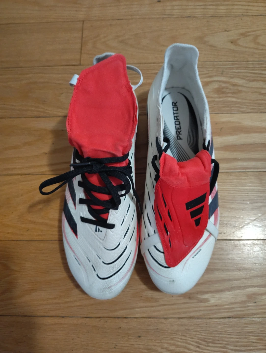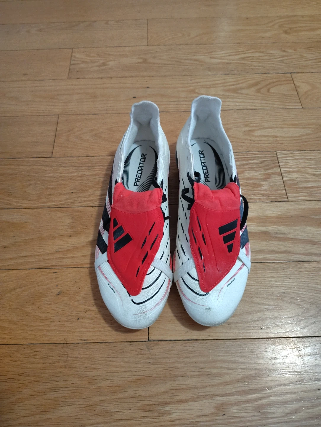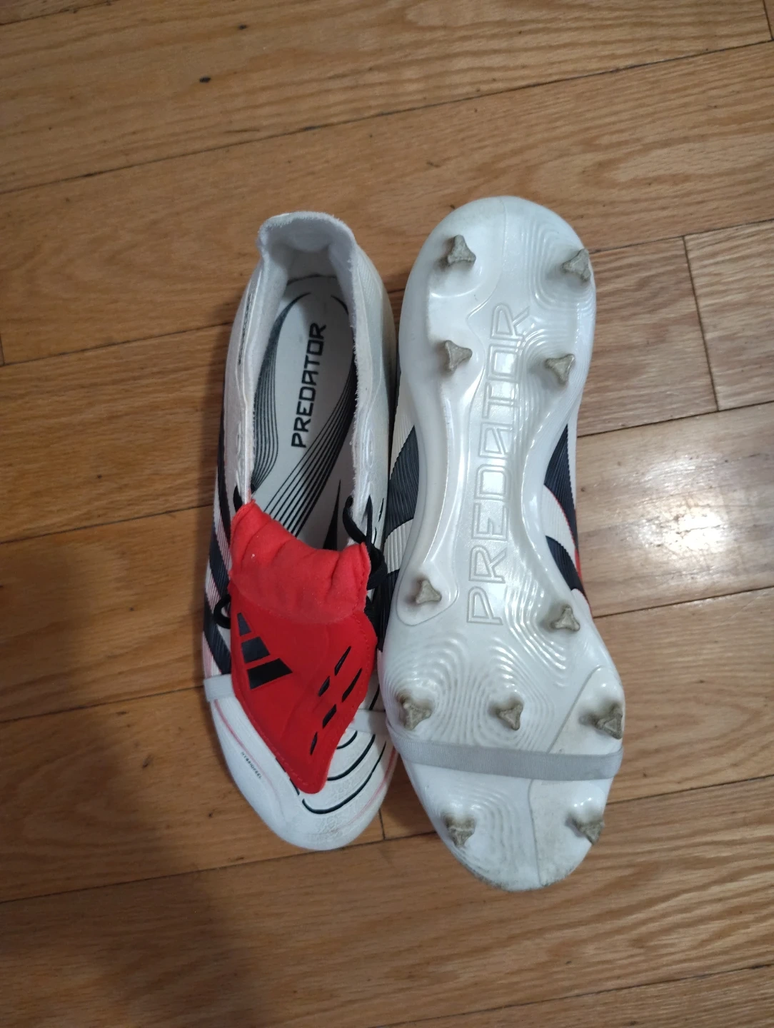 Selling a pair of Adidas Predator soccer cleats. They are white with a red tongue and black stripes. The cleats are in good condition and worn one time.