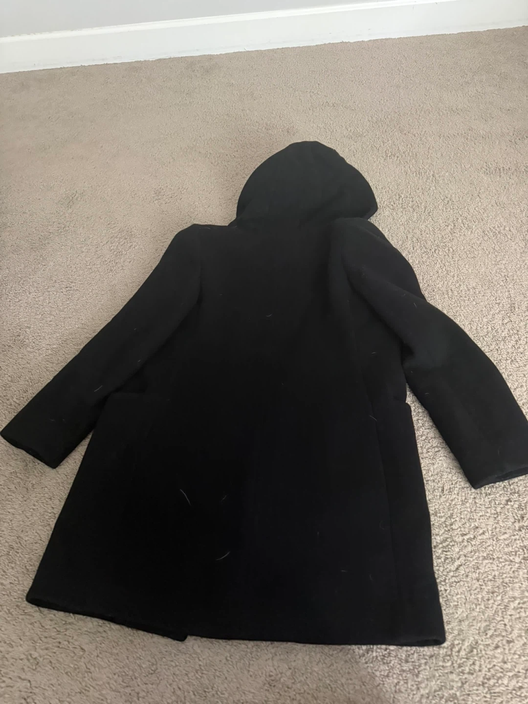 A stylish black coat with a hood and button closure. It's made from a wool blend with a smooth satin lining. This coat is perfect for cooler weather!