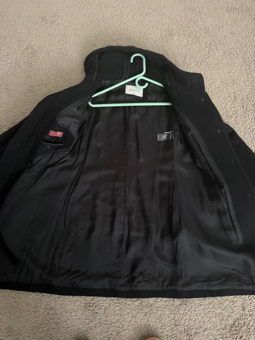 A stylish black coat with a hood and button closure. It's made from a wool blend with a smooth satin lining. This coat is perfect for cooler weather!