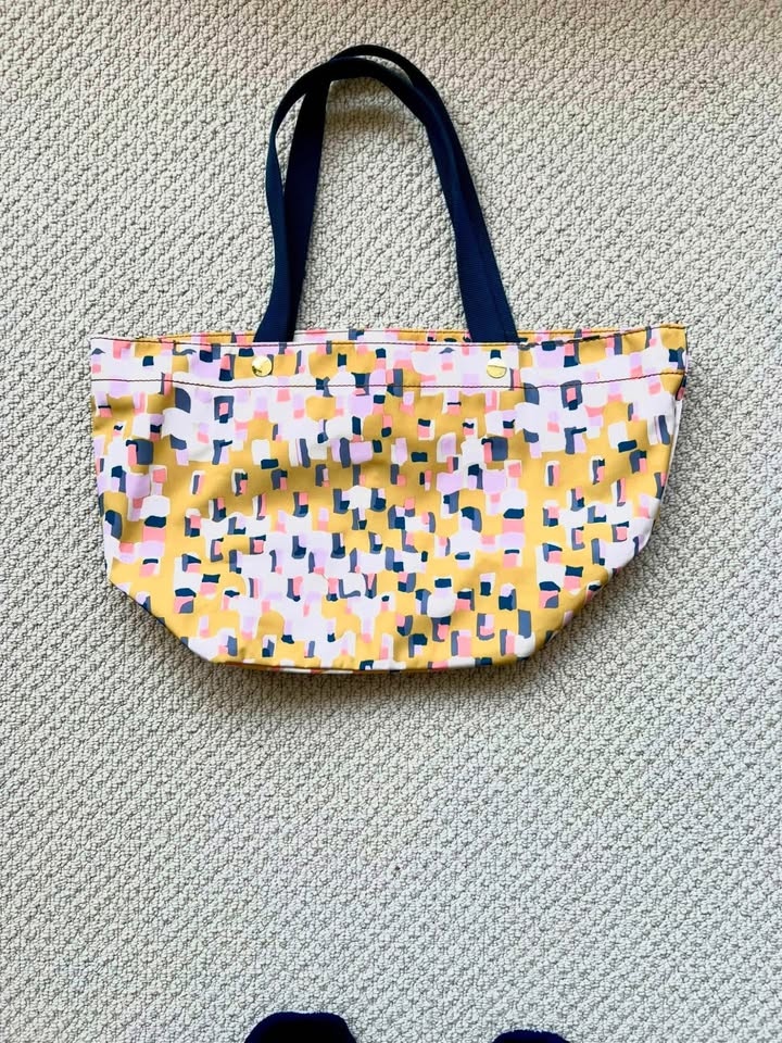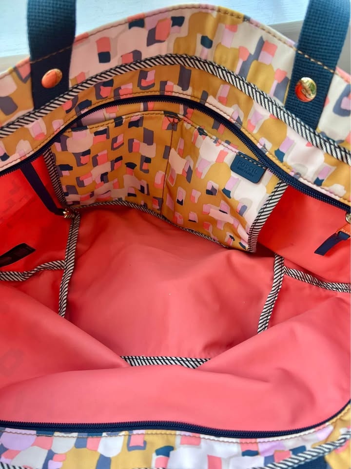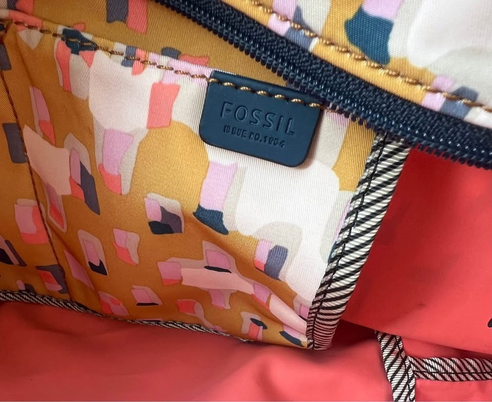 This is a charming Fossil tote bag, perfect for carrying your everyday essentials! It's in good condition and features a vibrant, colourful pattern. The bag has sturdy navy blue straps, gold hardware and a spacious interior with a zippered pocket to keep your valuables secure.