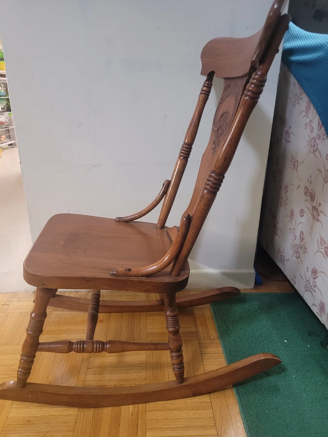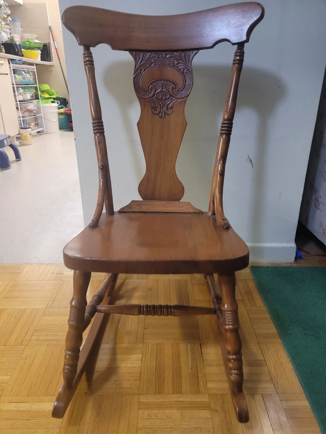 Selling a beautiful wooden rocking chair. It's made of solid wood and has a lovely, classic design. It's in perfect condition and would be a great addition to any home. Perfect for relaxing after a long day! Its more like child sized. Although adults can use too