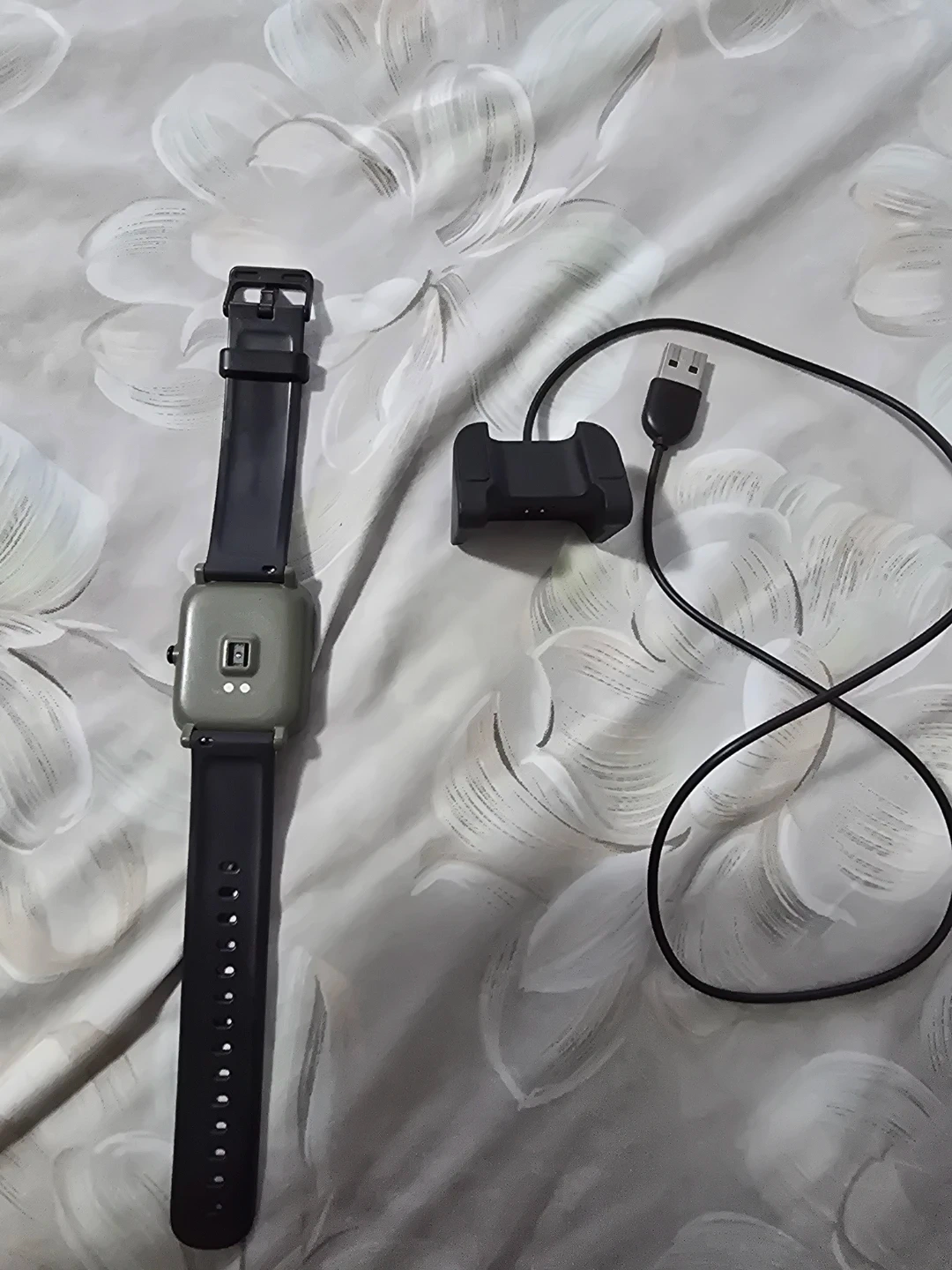 Amazfit smartwatch in a green casing with a black strap. It tracks steps and shows the time. Includes its charging cable and dock.has call and message notification...best battery backup
