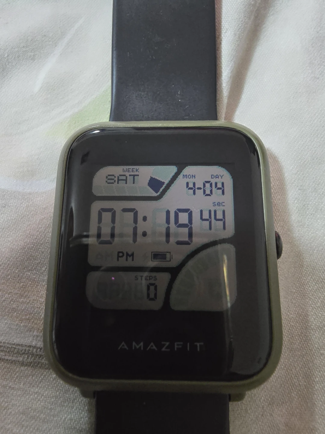 Amazfit smartwatch in a green casing with a black strap. It tracks steps and shows the time. Includes its charging cable and dock.has call and message notification...best battery backup