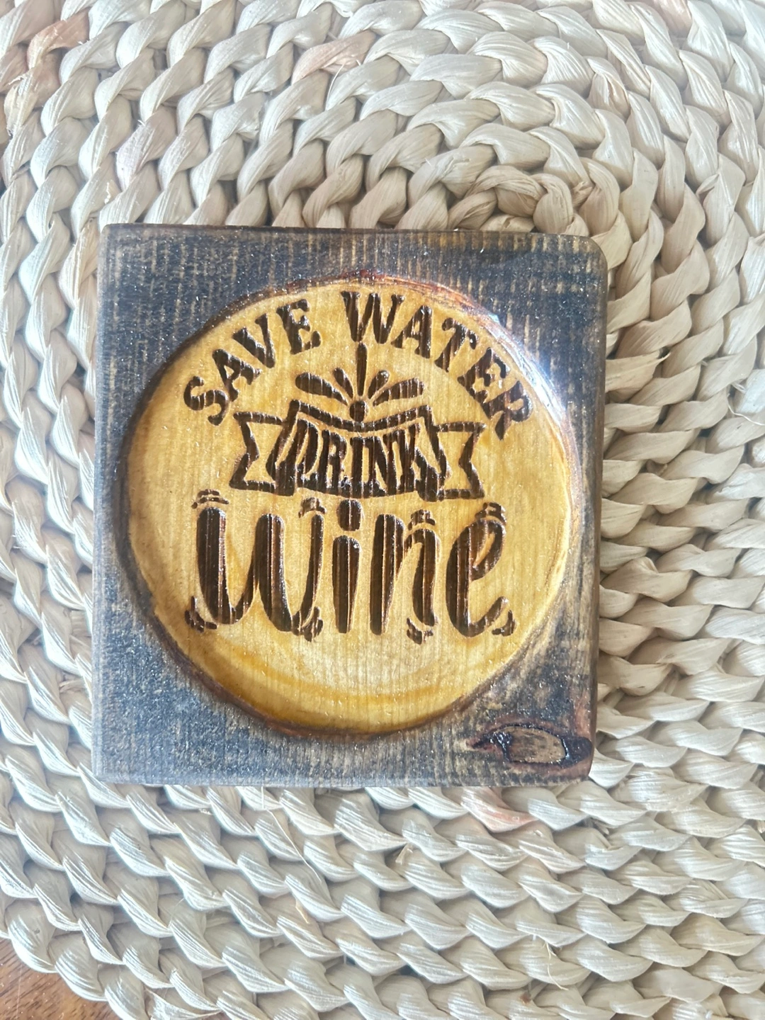 I'm selling a set of four coasters with funny drink-related sayings. These are perfect for adding a bit of humour to your home decor! They are made of wood and have a rustic look.