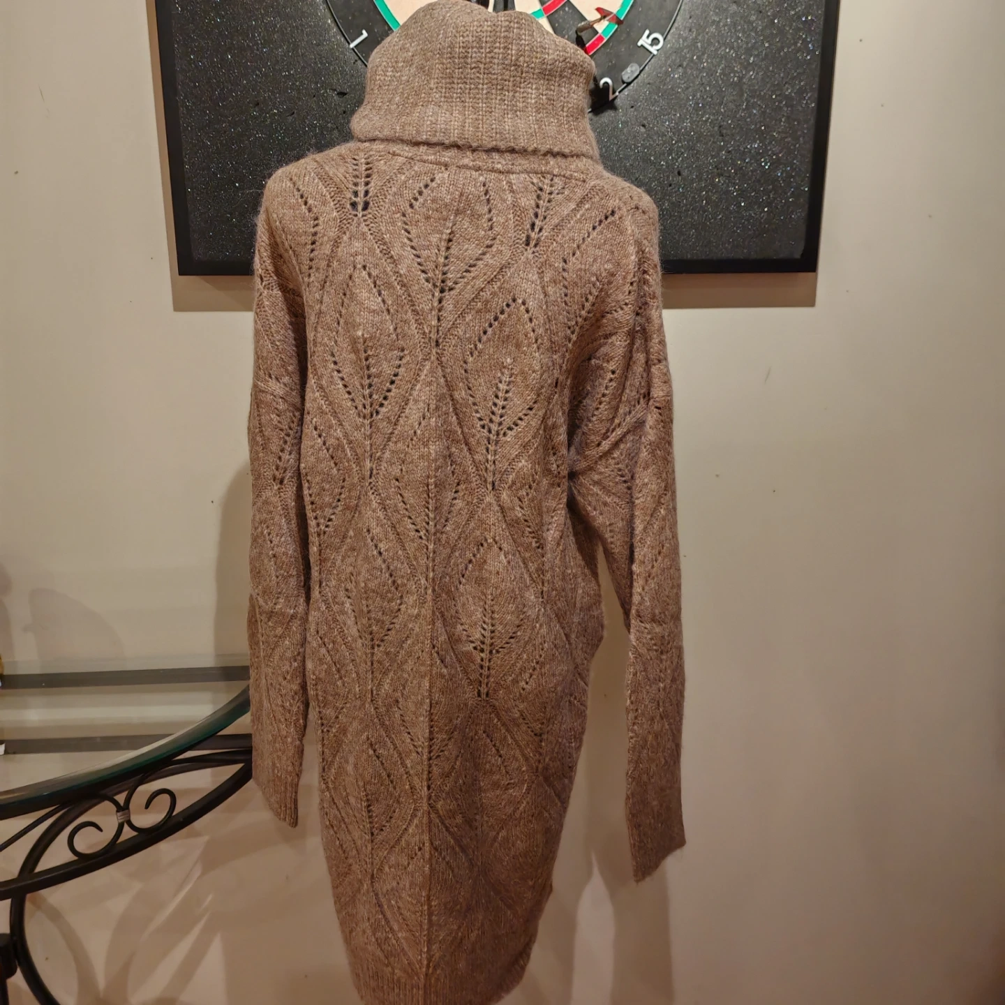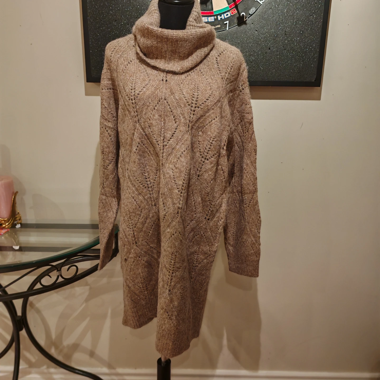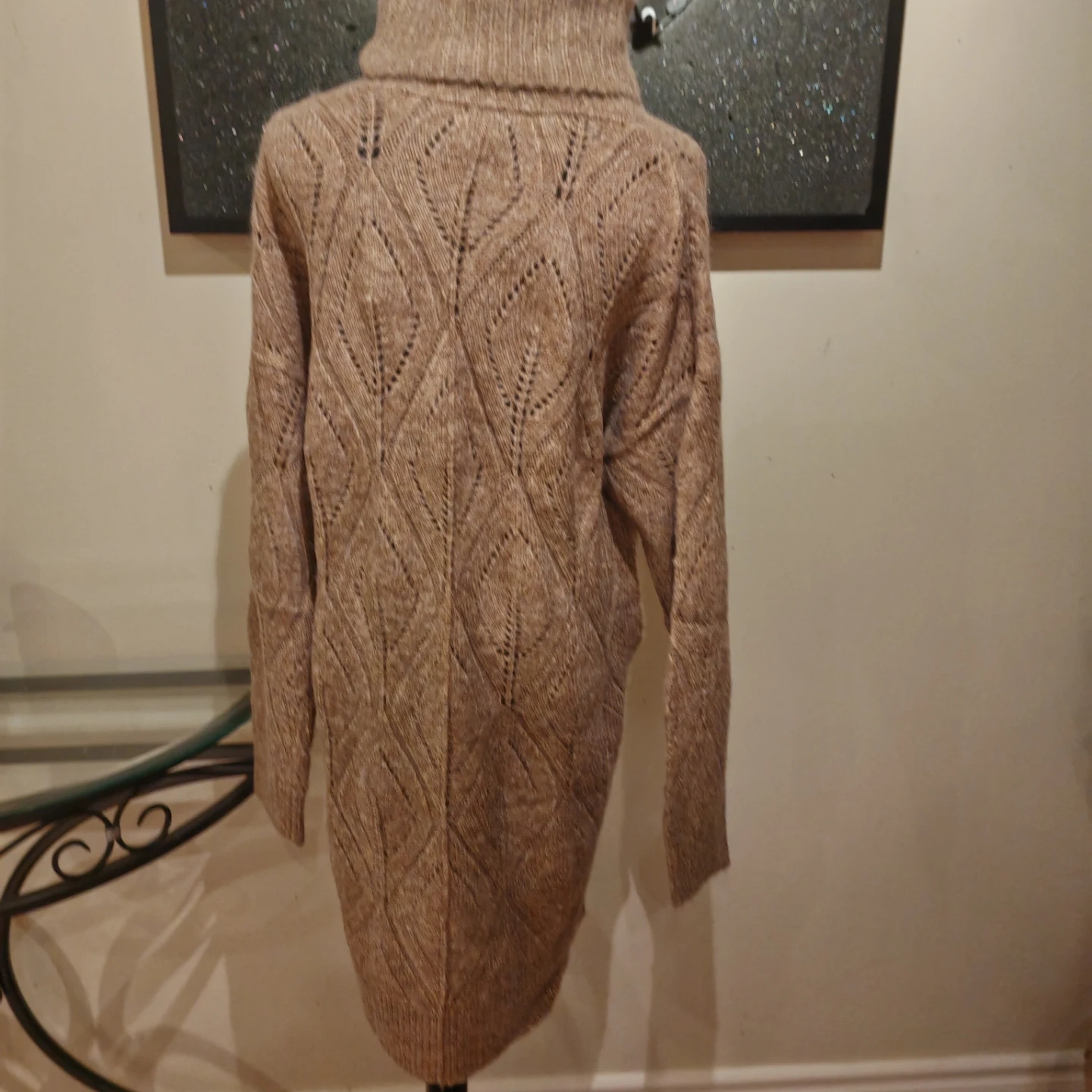 Cozy tan sweater dress with a chunky knit and turtleneck collar. Features a lovely open knit pattern throughout. This dress is perfect for staying warm and stylish during colder months!