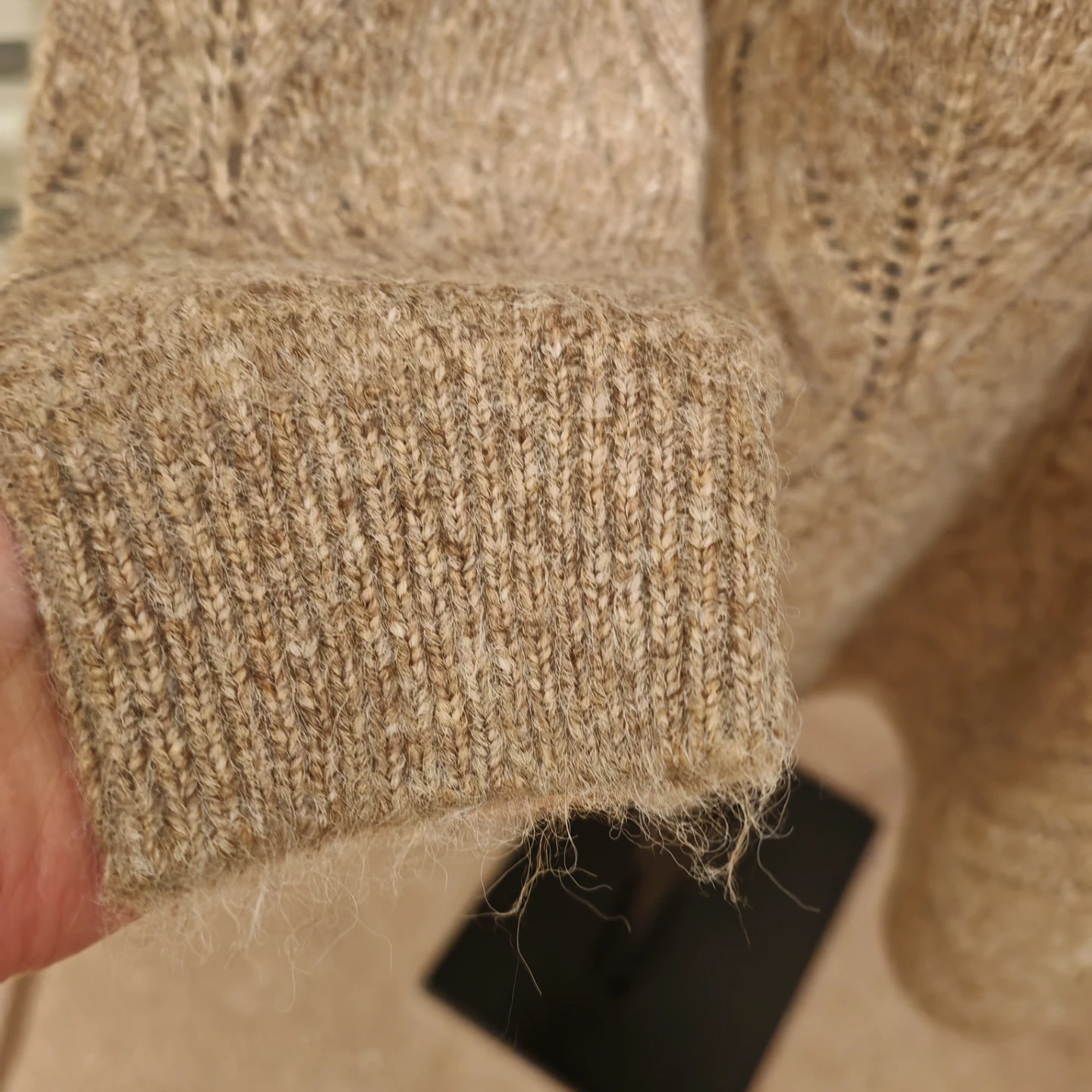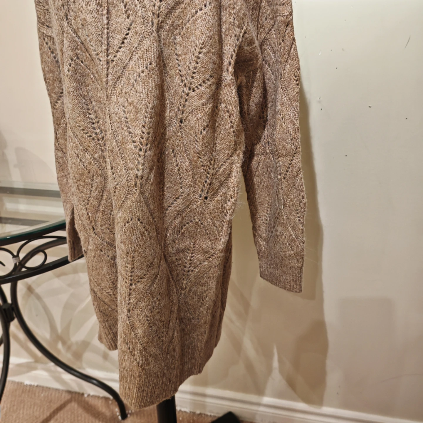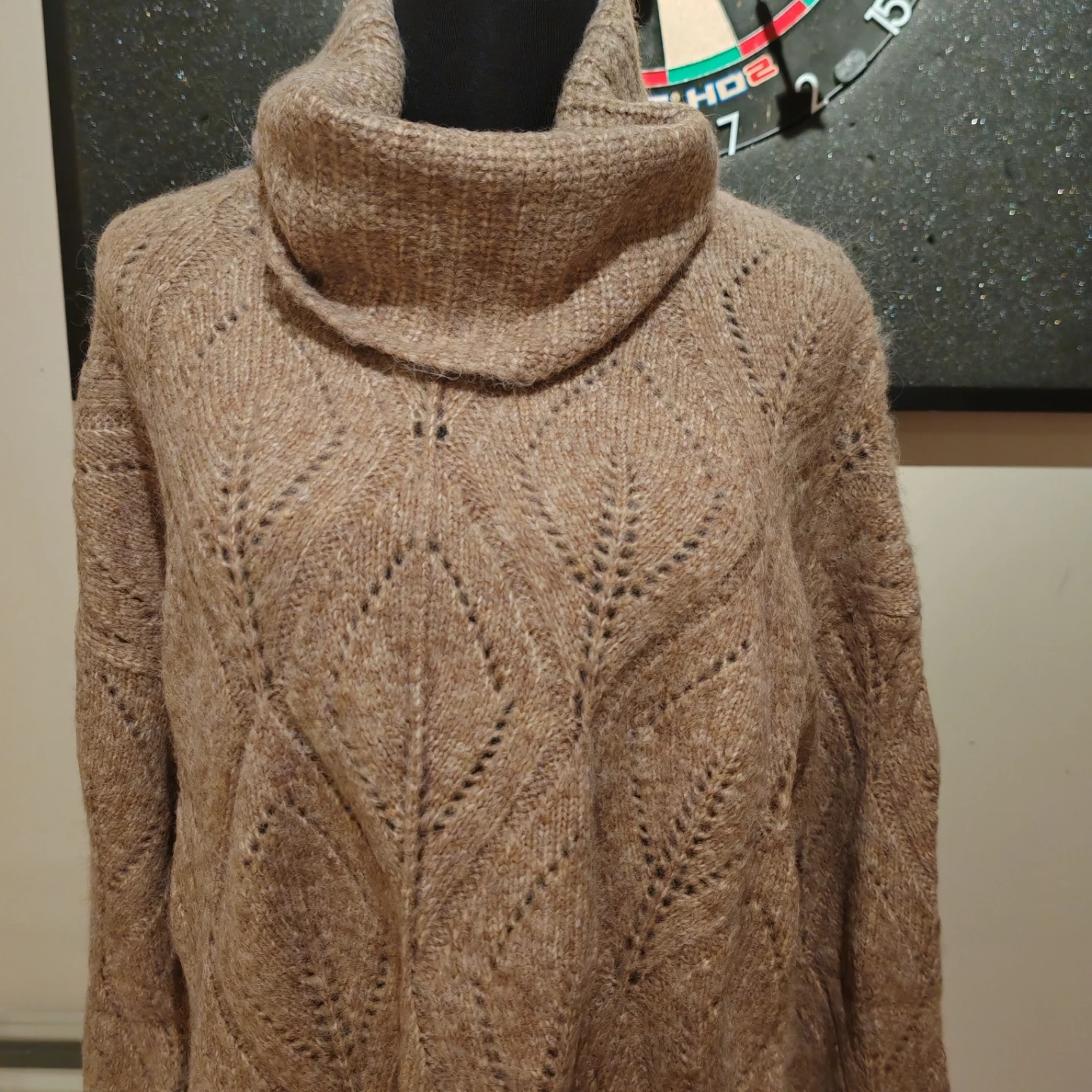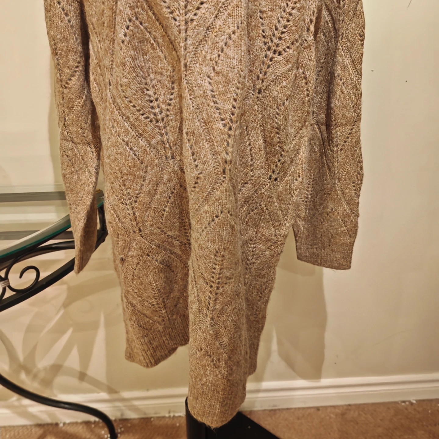 Cozy tan sweater dress with a chunky knit and turtleneck collar. Features a lovely open knit pattern throughout. This dress is perfect for staying warm and stylish during colder months!