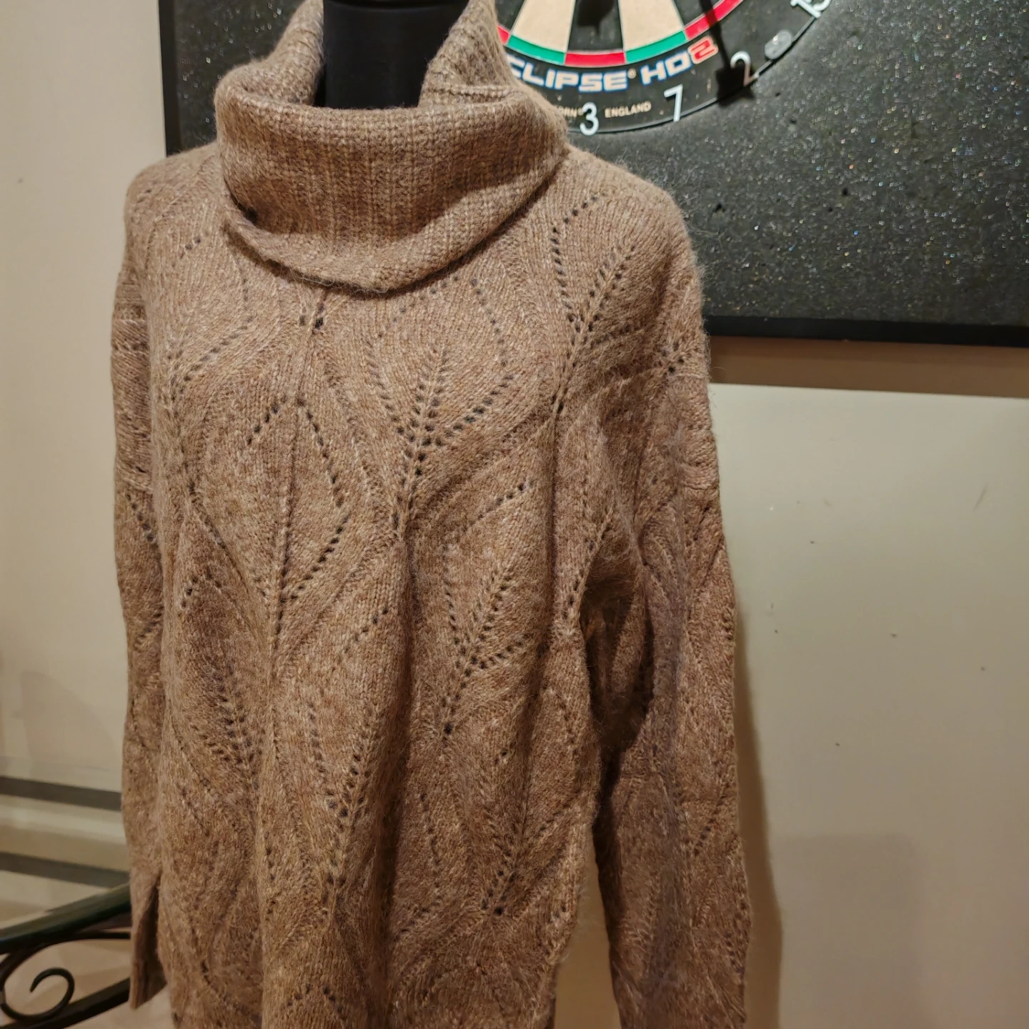 Cozy tan sweater dress with a chunky knit and turtleneck collar. Features a lovely open knit pattern throughout. This dress is perfect for staying warm and stylish during colder months!
