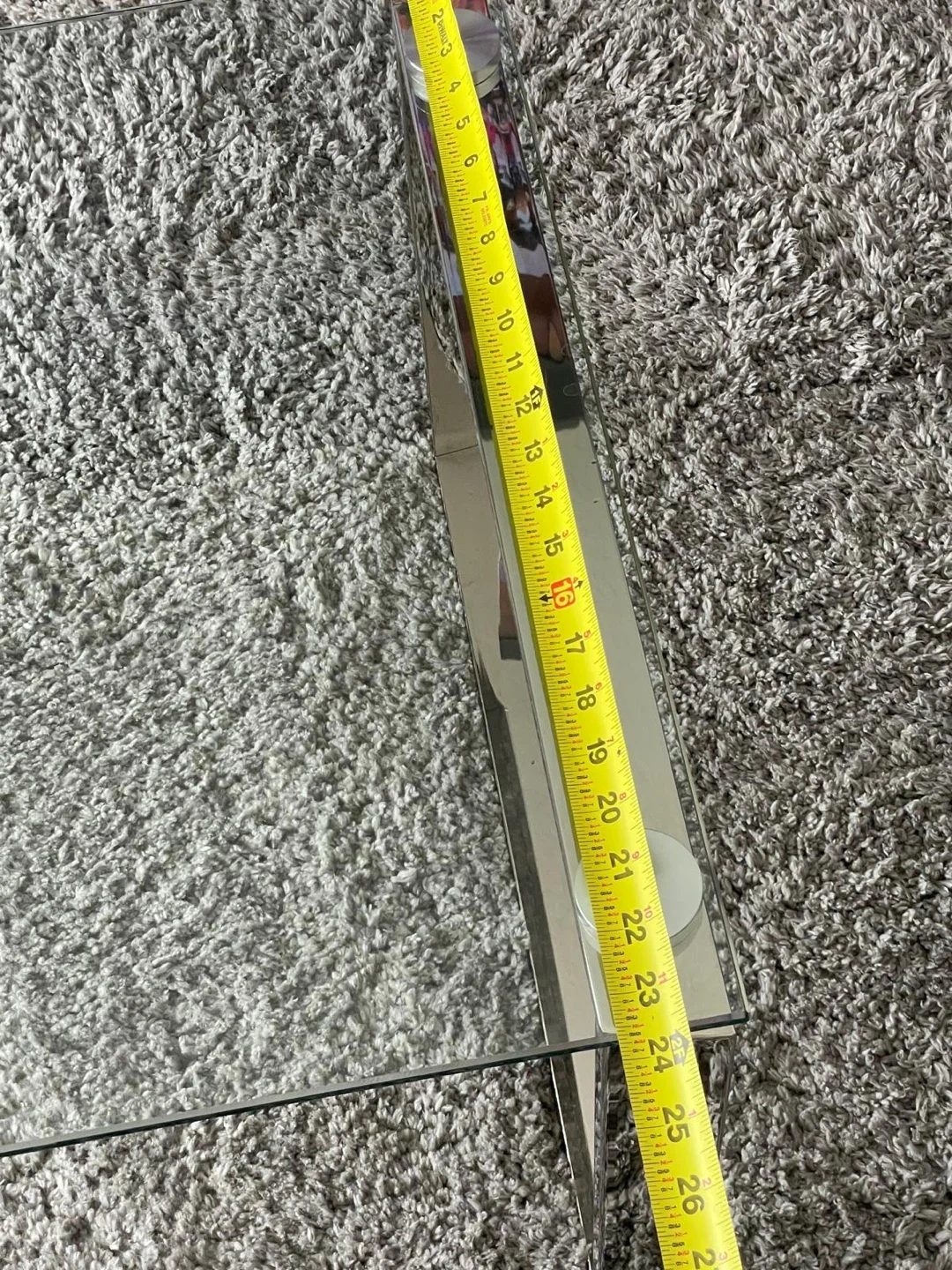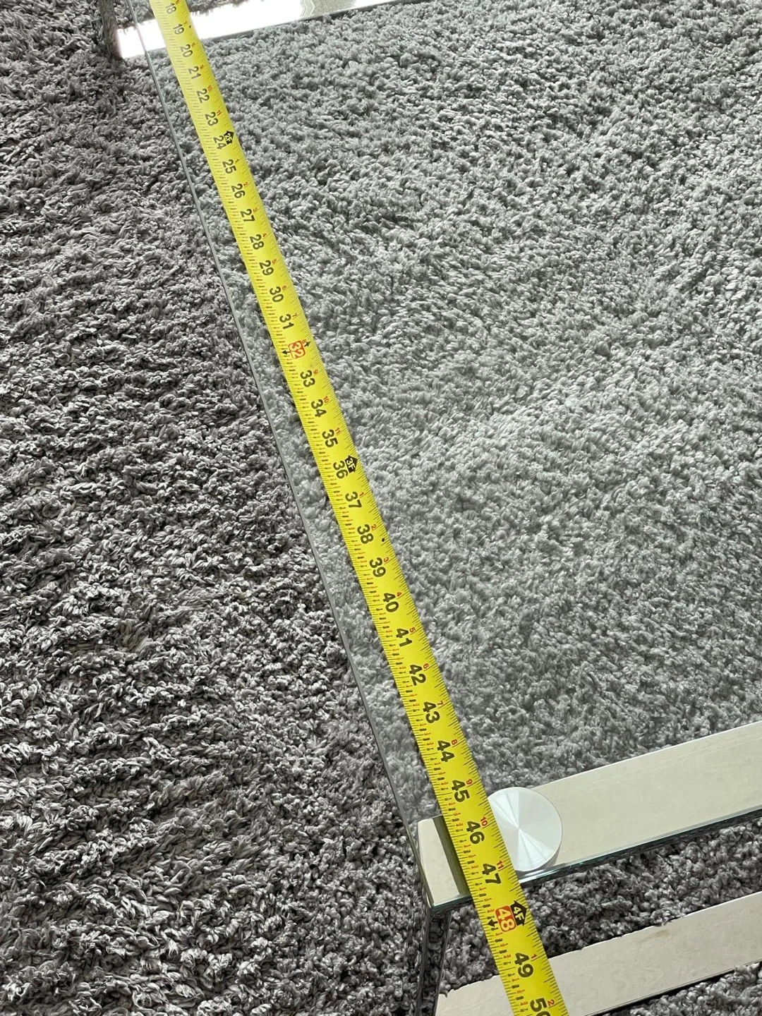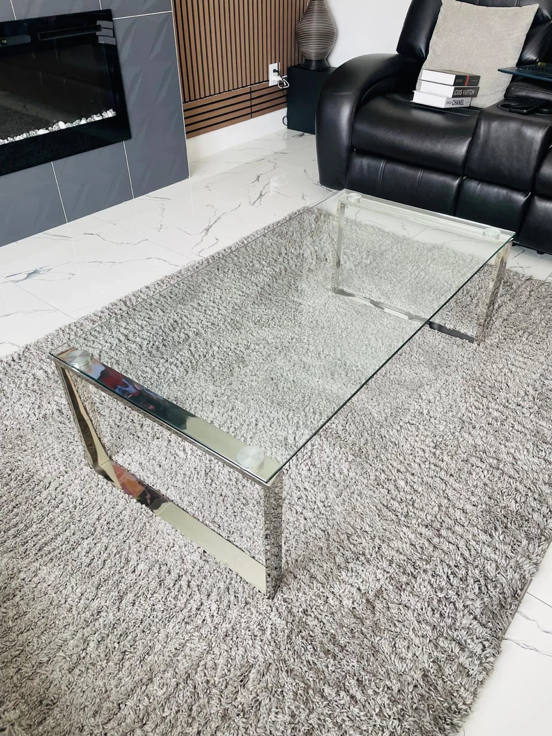 Modern glass coffee table with a sleek chrome frame. It's approximately 47 inches long and 20 inches wide. The glass top has a minimalist design, perfect for contemporary living spaces. Bought from the Brick two weeks ago. Asked $155.