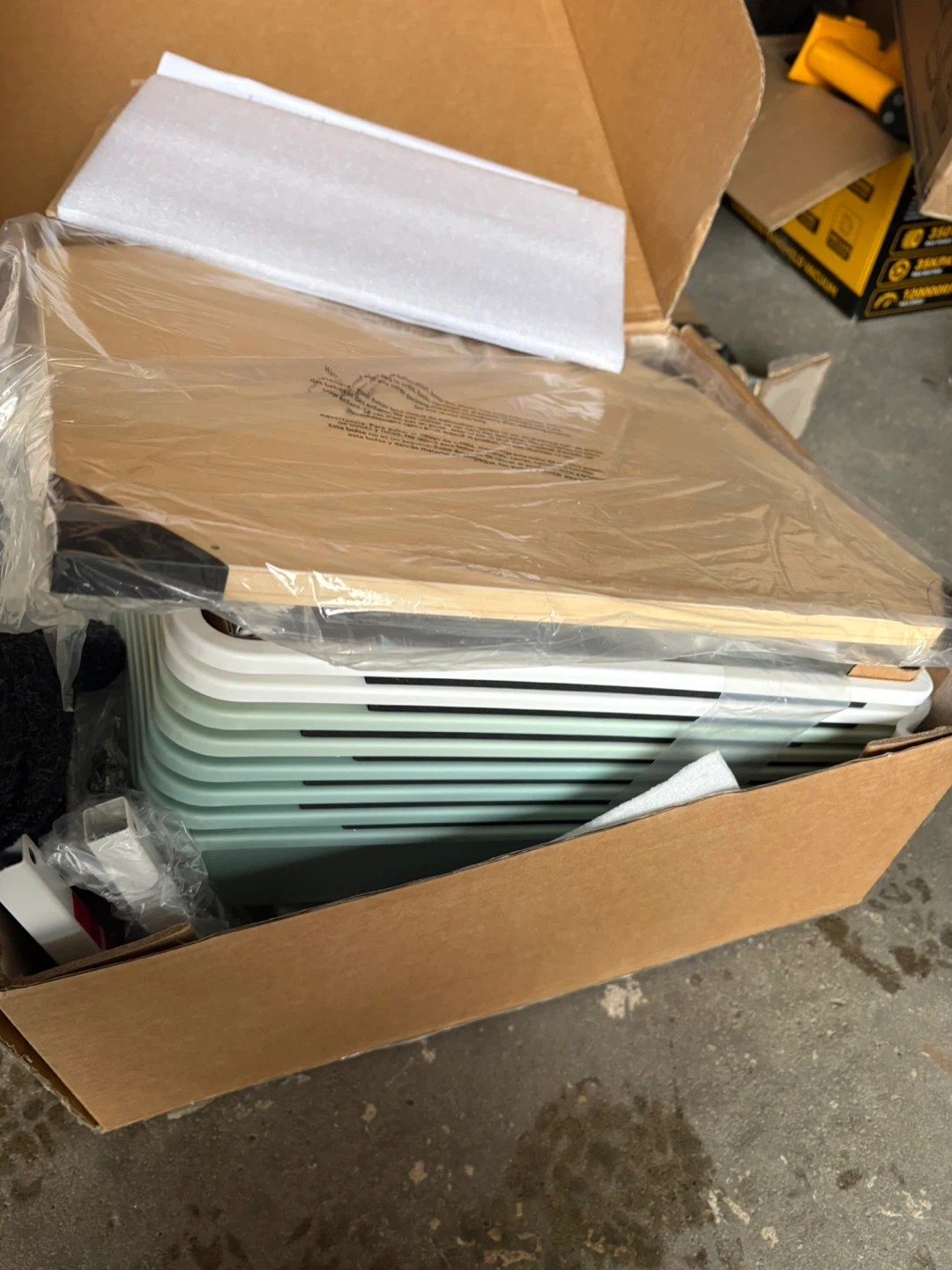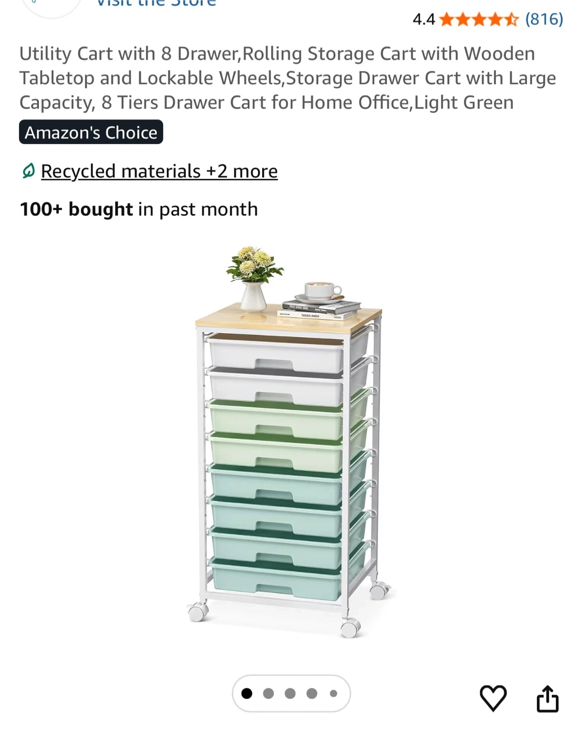 This rolling cart features a light green colour with a wooden top. It has 8 drawers for ample storage space and lockable wheels. Dimensions are 31.18 inches high and 15.55 inches wide.
