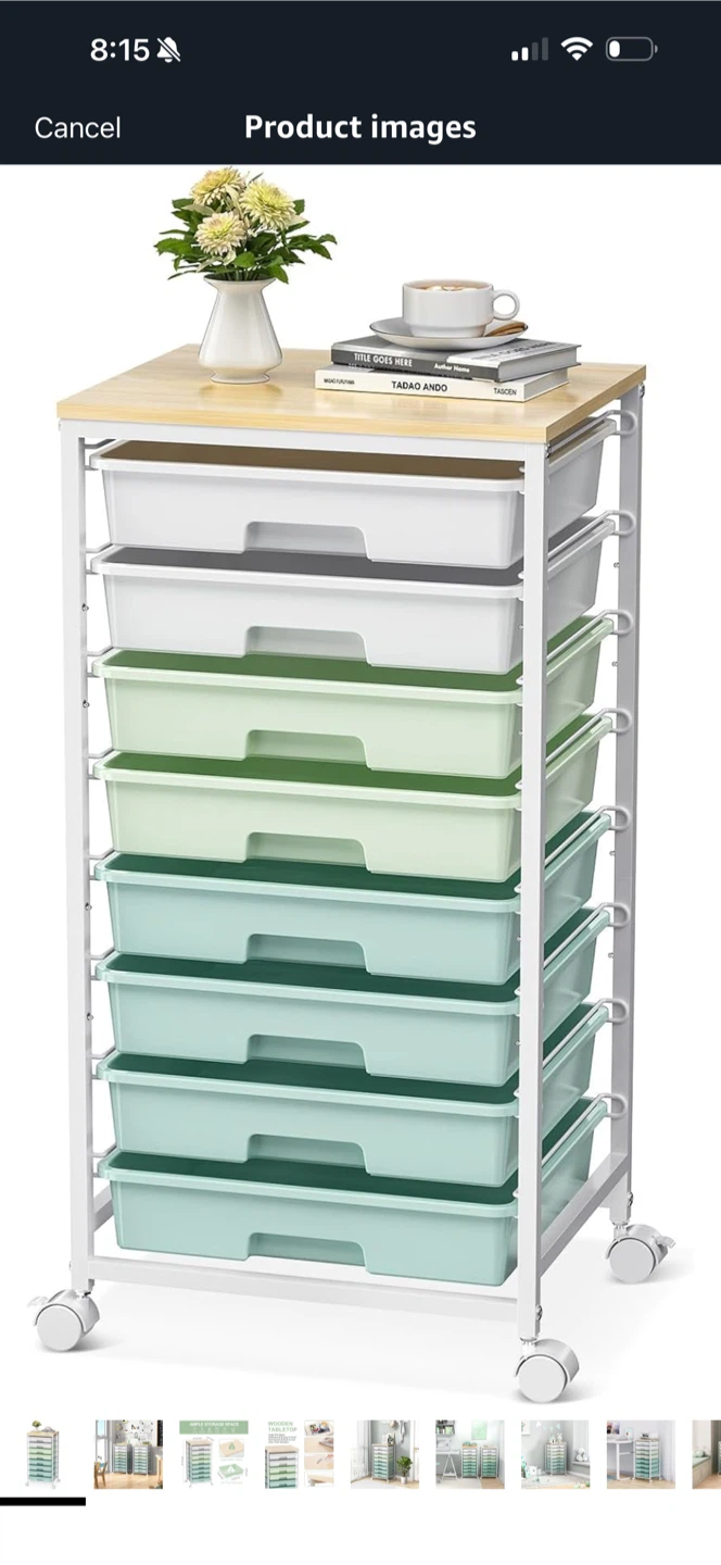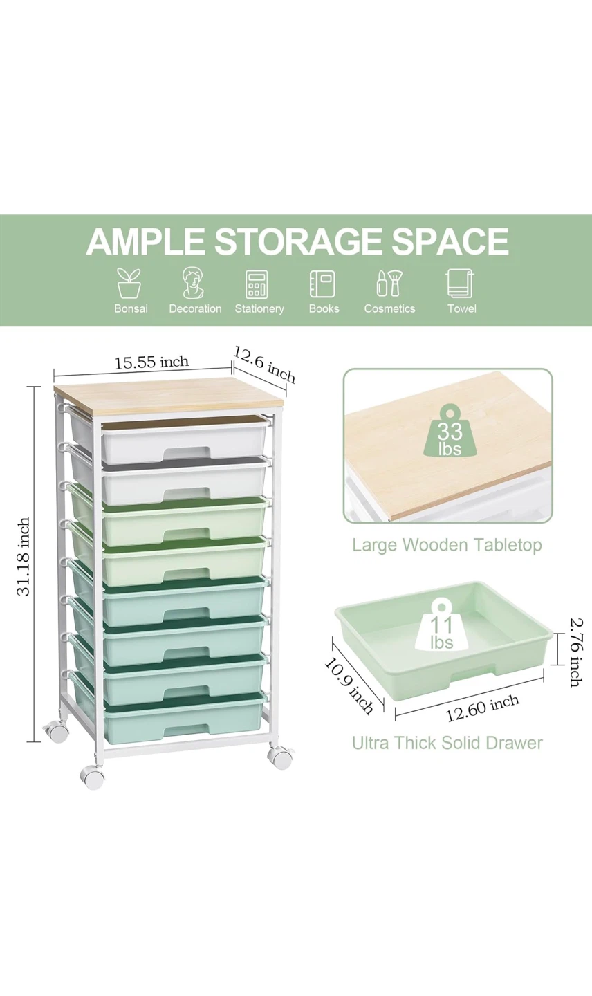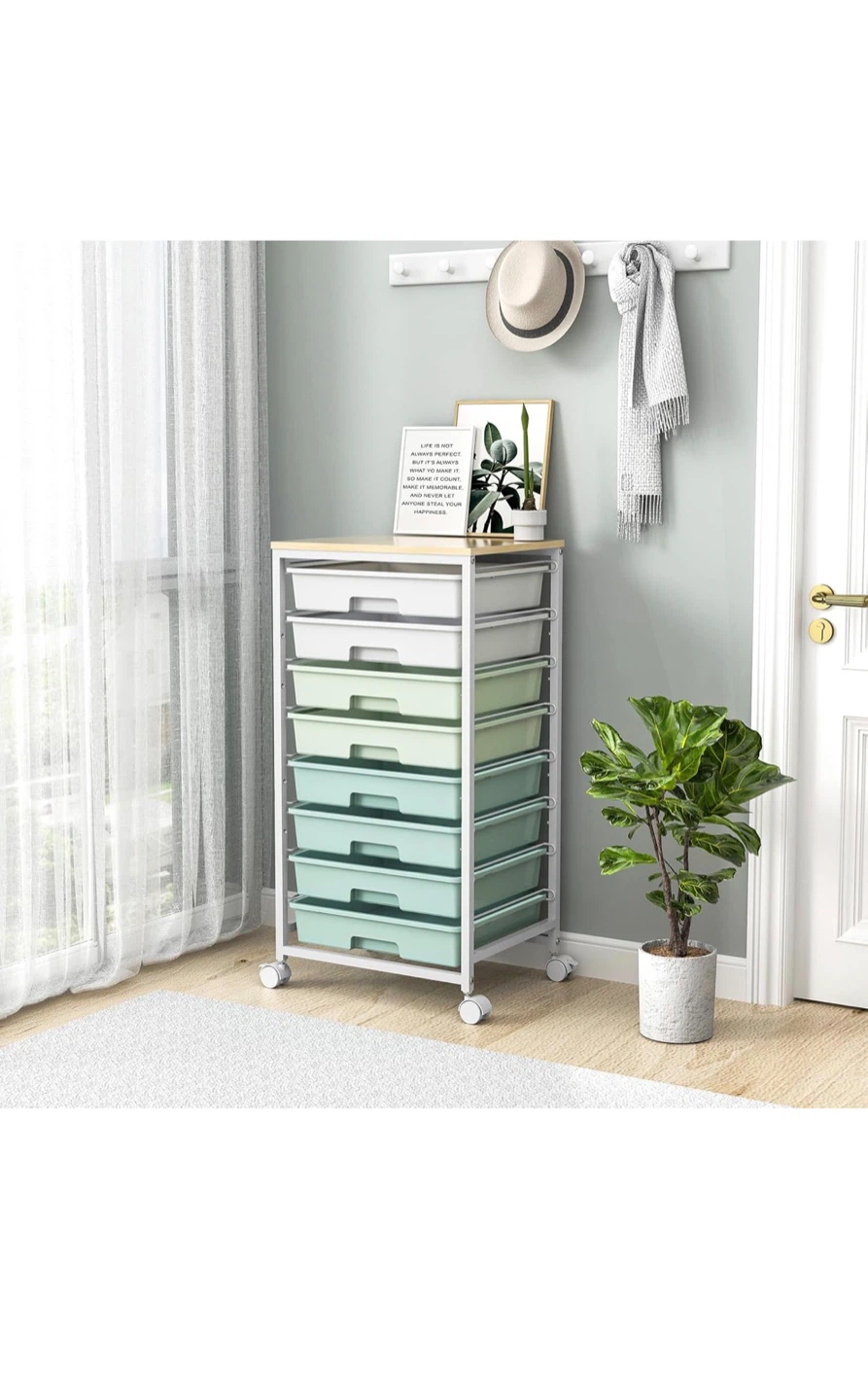This rolling cart features a light green colour with a wooden top. It has 8 drawers for ample storage space and lockable wheels. Dimensions are 31.18 inches high and 15.55 inches wide.
