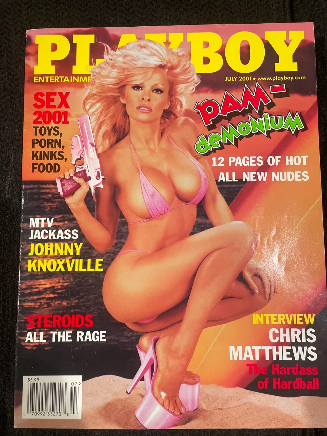 This is the July 2001 issue of Playboy Magazine featuring Pam Anderson on the cover. It includes an interview with Chris Matthews and content on MTV Jackass and Johnny Knoxville.
