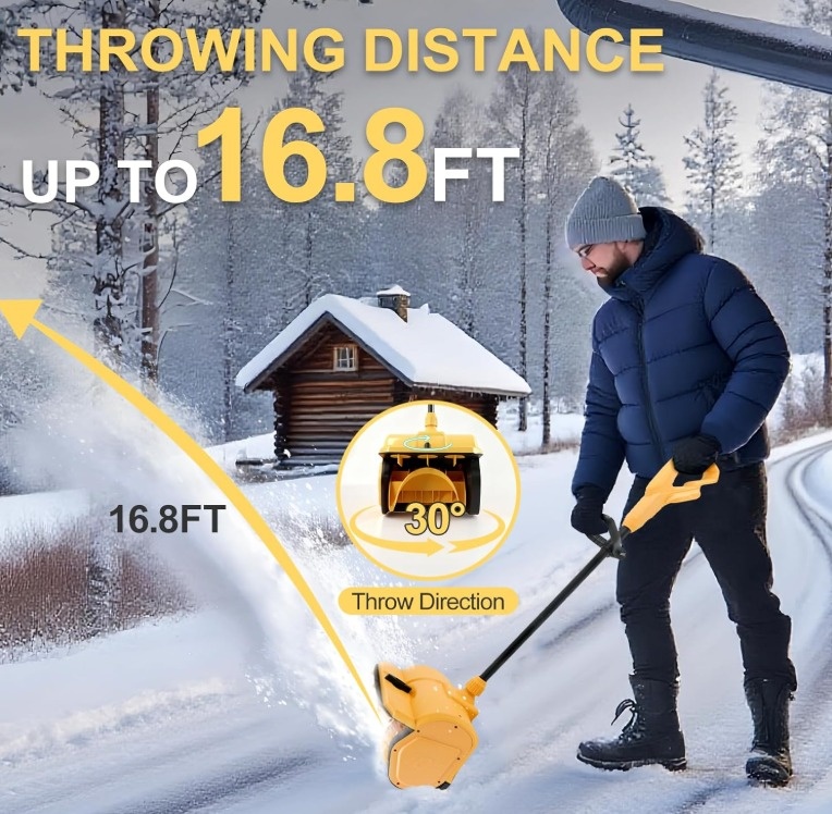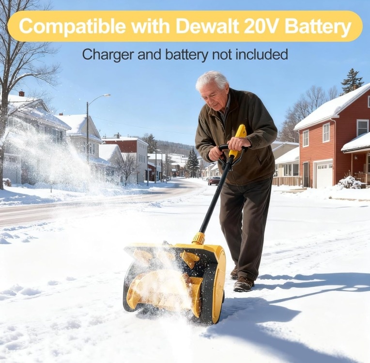 12" Cordless Snow Thrower Compatible with Dewalt 20V Battery (Battery not included). 30cm Width x 15cm Depth Clearing, Brushless Motor, Auxiliary Handle, 3-Direction Adjustable.
