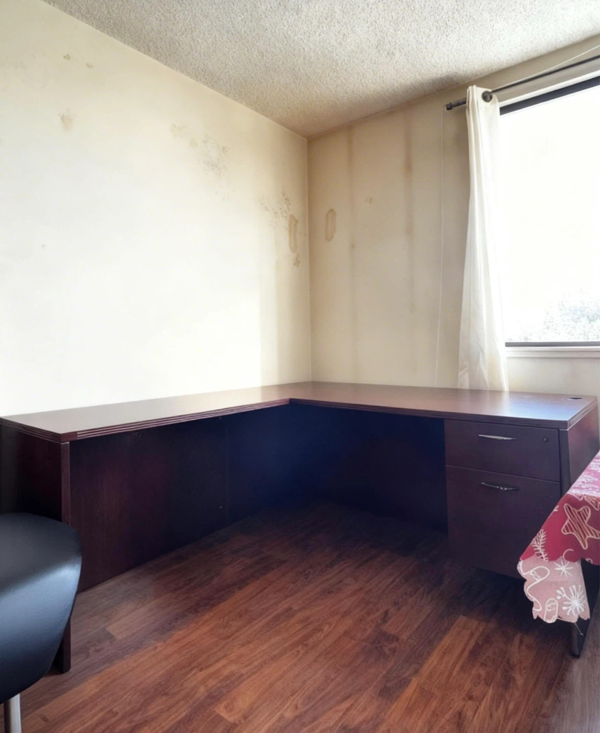 Spacious L-shaped office desk in a dark brown finish. It features a convenient set of drawers on one side for storage. This desk offers ample workspace for your home office needs. It's sturdy and ready for its new home!