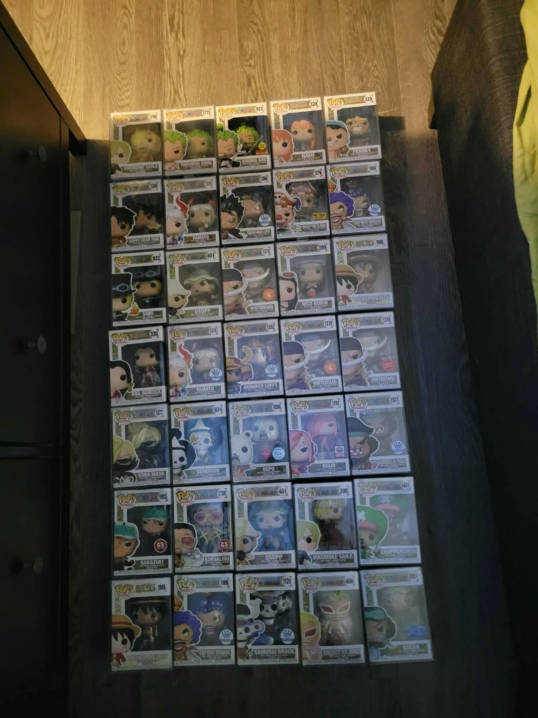 Collection of Funko Pop! vinyl figures from the One Piece anime series. Includes various characters like Luffy, Zoro, Yamato, and Whitebeard. Each figure comes in its original display box.