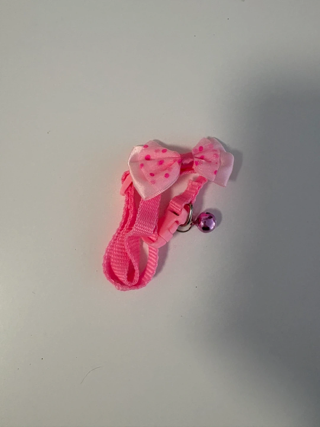 This is a cute pink cat/ small dog collar, complete with a bow and a bell! It's perfect for taking your feline friend on safe and stylish outdoor adventures around the neighbourhood