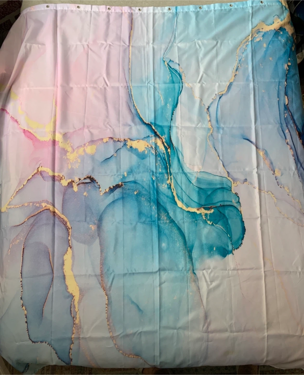 Features a beautiful abstract marble / stalactite design with pink, blue, and gold accents. Made from a durable, water-resistant material.