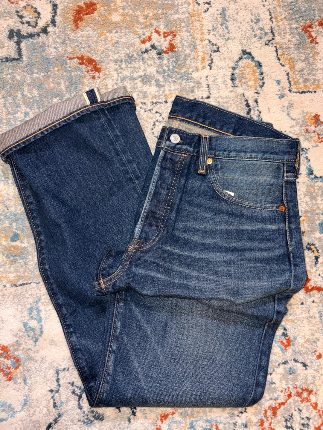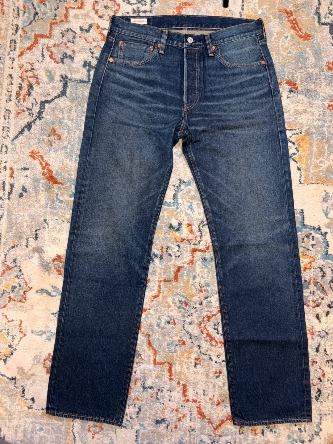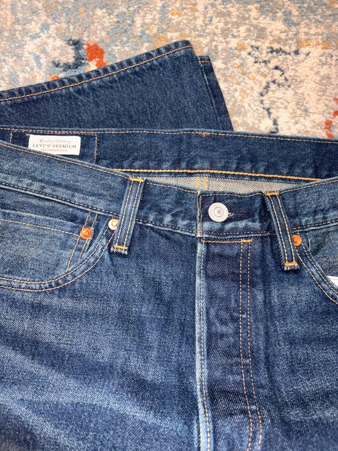 These are new Levi's Premium jeans in a dark wash. They feature a button fly closure and classic stitching. Retail price is $198 but selling it for $100. Size is 32*32.