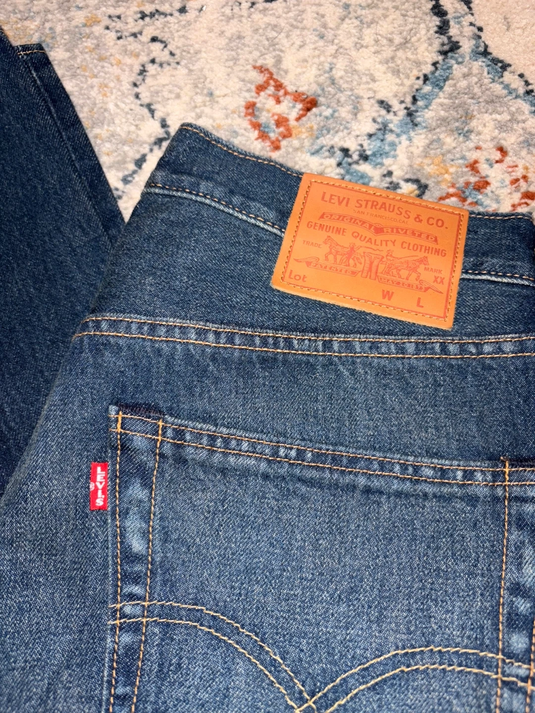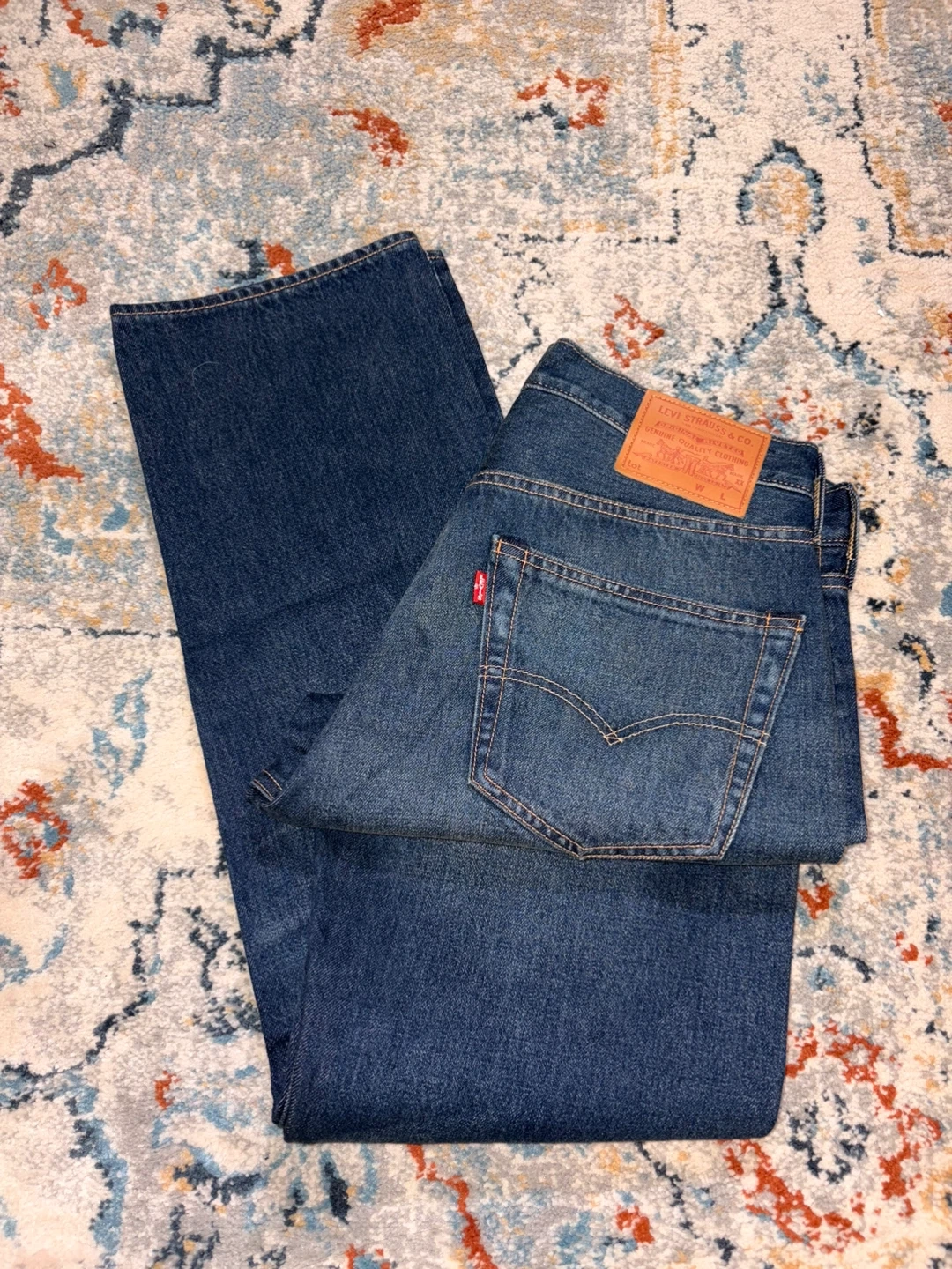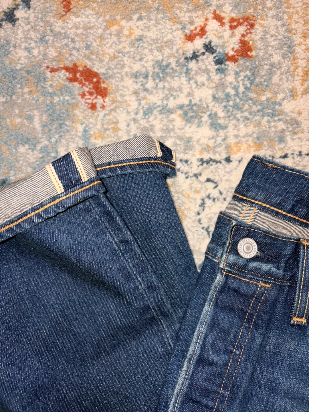 These are new Levi's Premium jeans in a dark wash. They feature a button fly closure and classic stitching. Retail price is $198 but selling it for $100. Size is 32*32.
